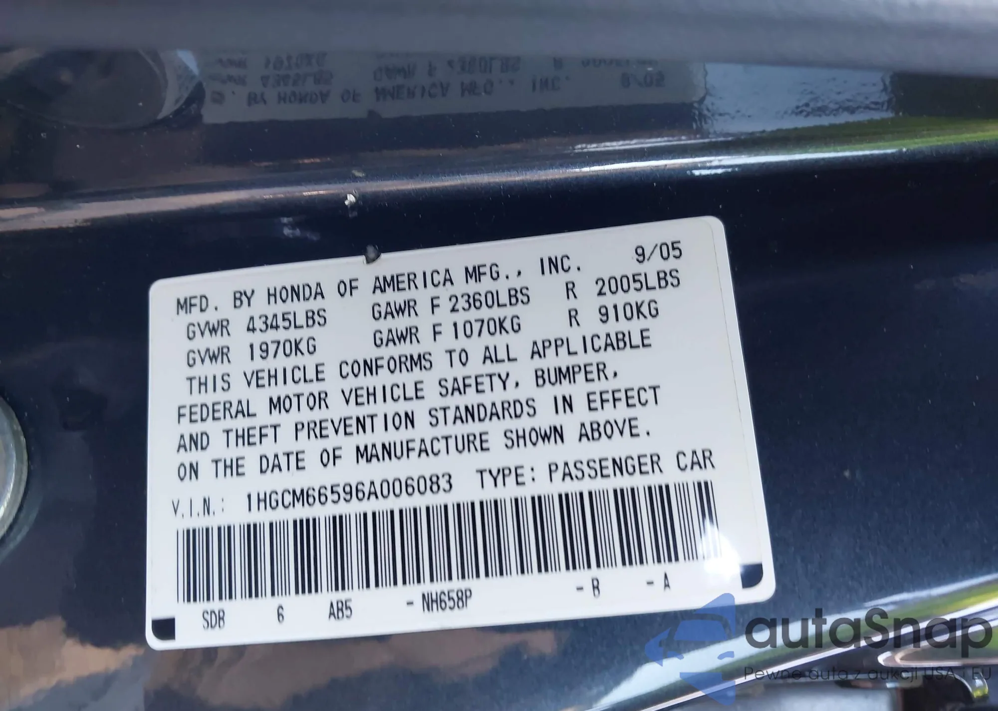 LOT: 44201762 VIN: 1HGCM66596A006083