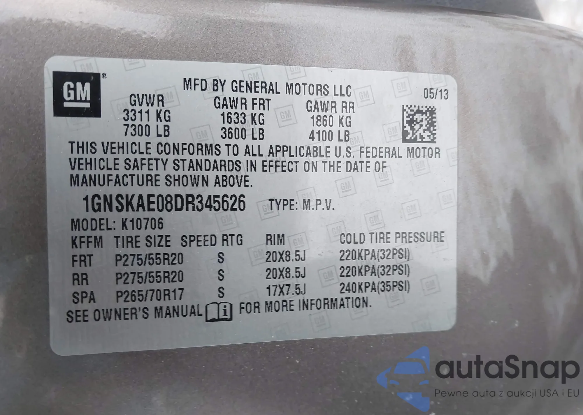 LOT: 44143794 VIN: 1GNSKAE08DR345626