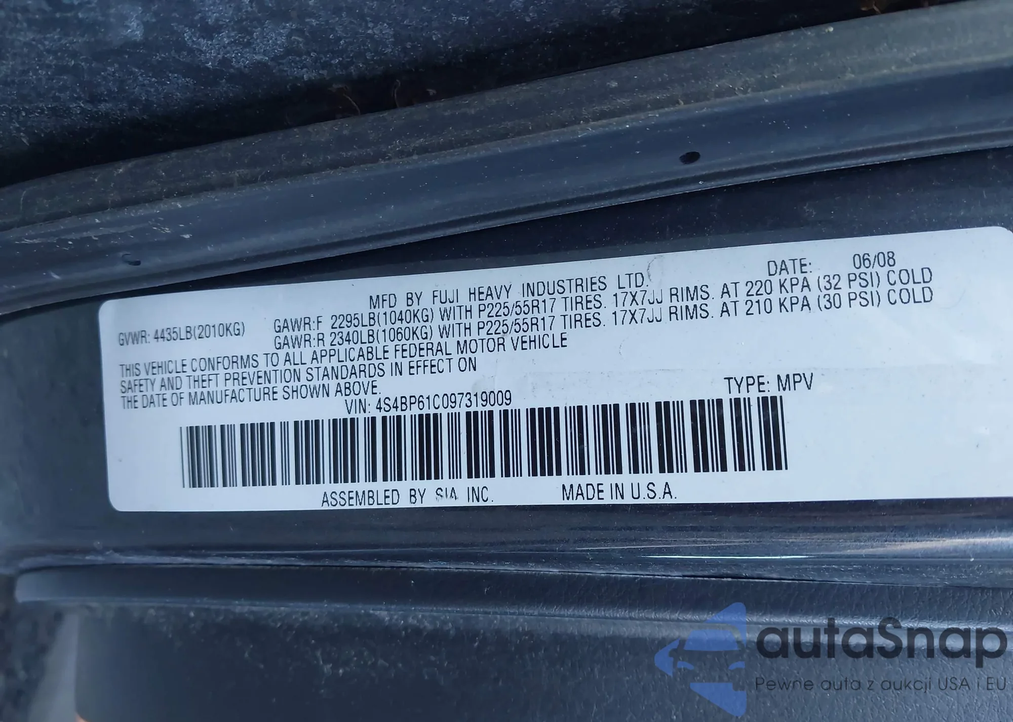 • VIN 4S4BP61C097319009