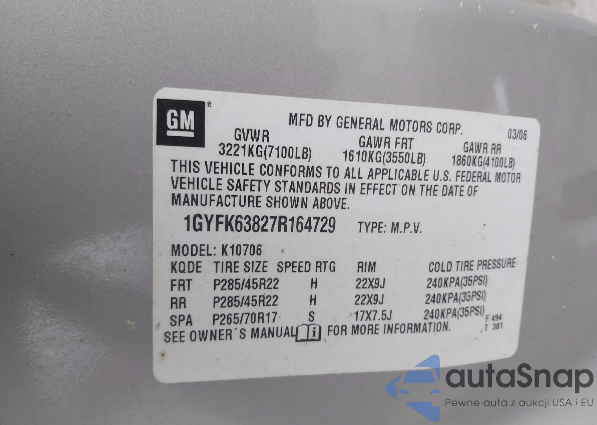 • VIN 1GYFK63827R164729