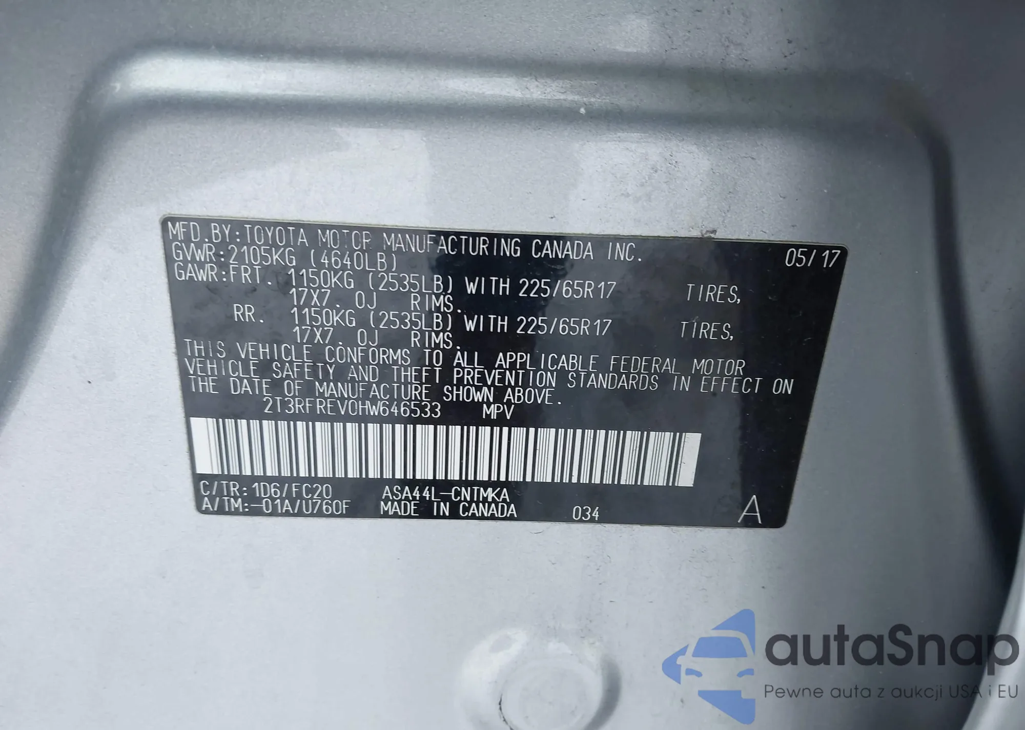 LOT: 44046702 VIN: 2T3RFREV0HW646533