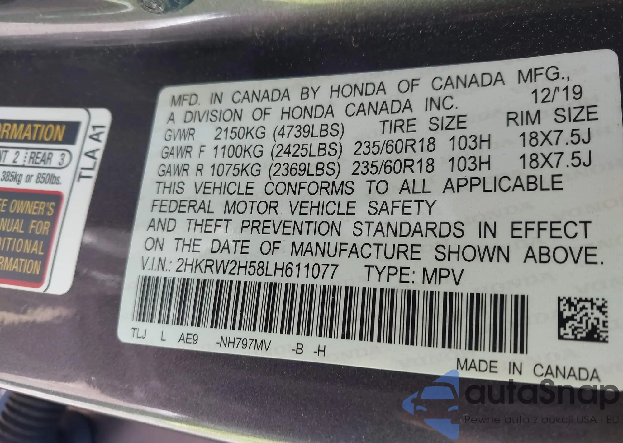 • VIN 2HKRW2H58LH611077