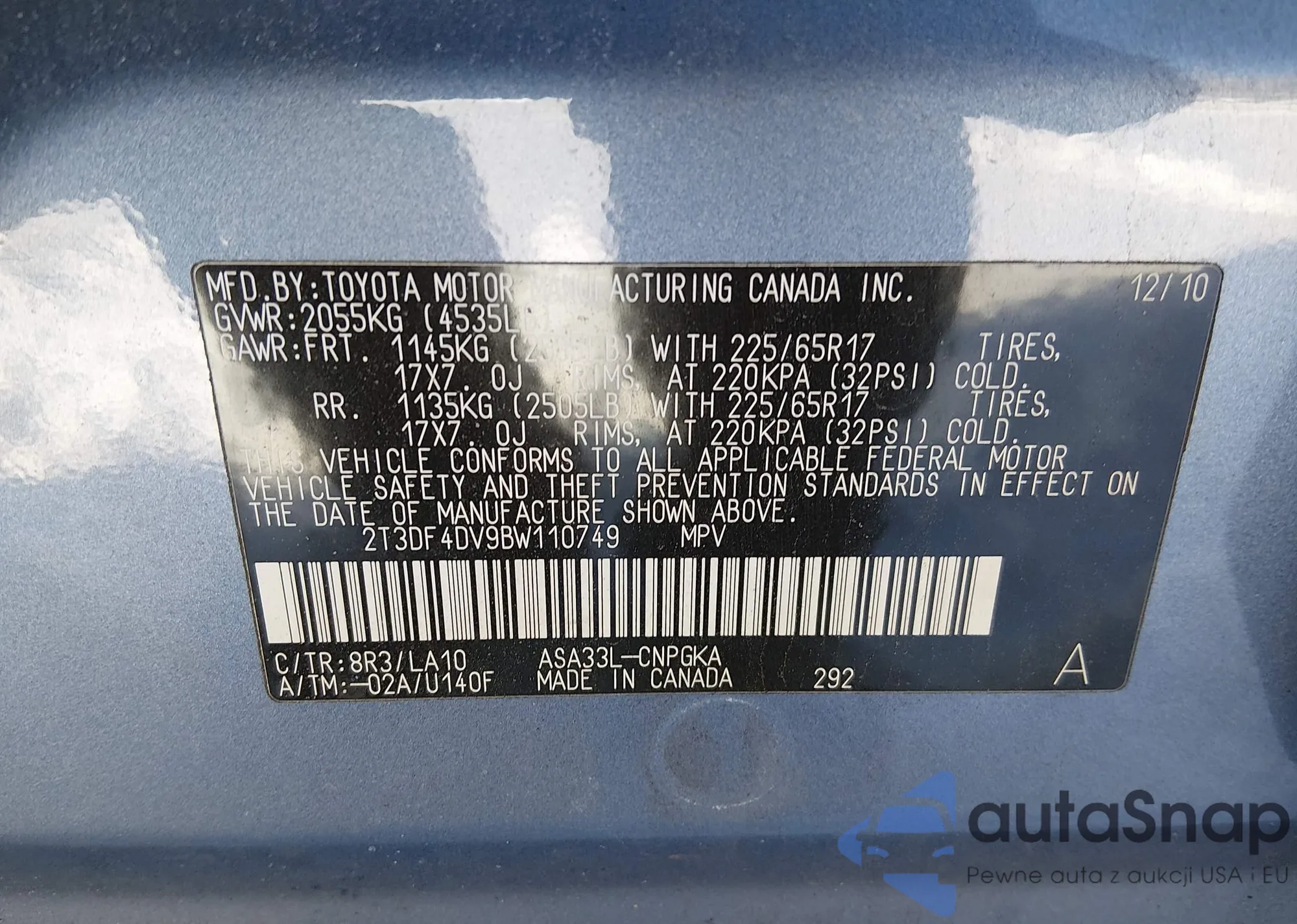 • VIN 2T3DF4DV9BW110749