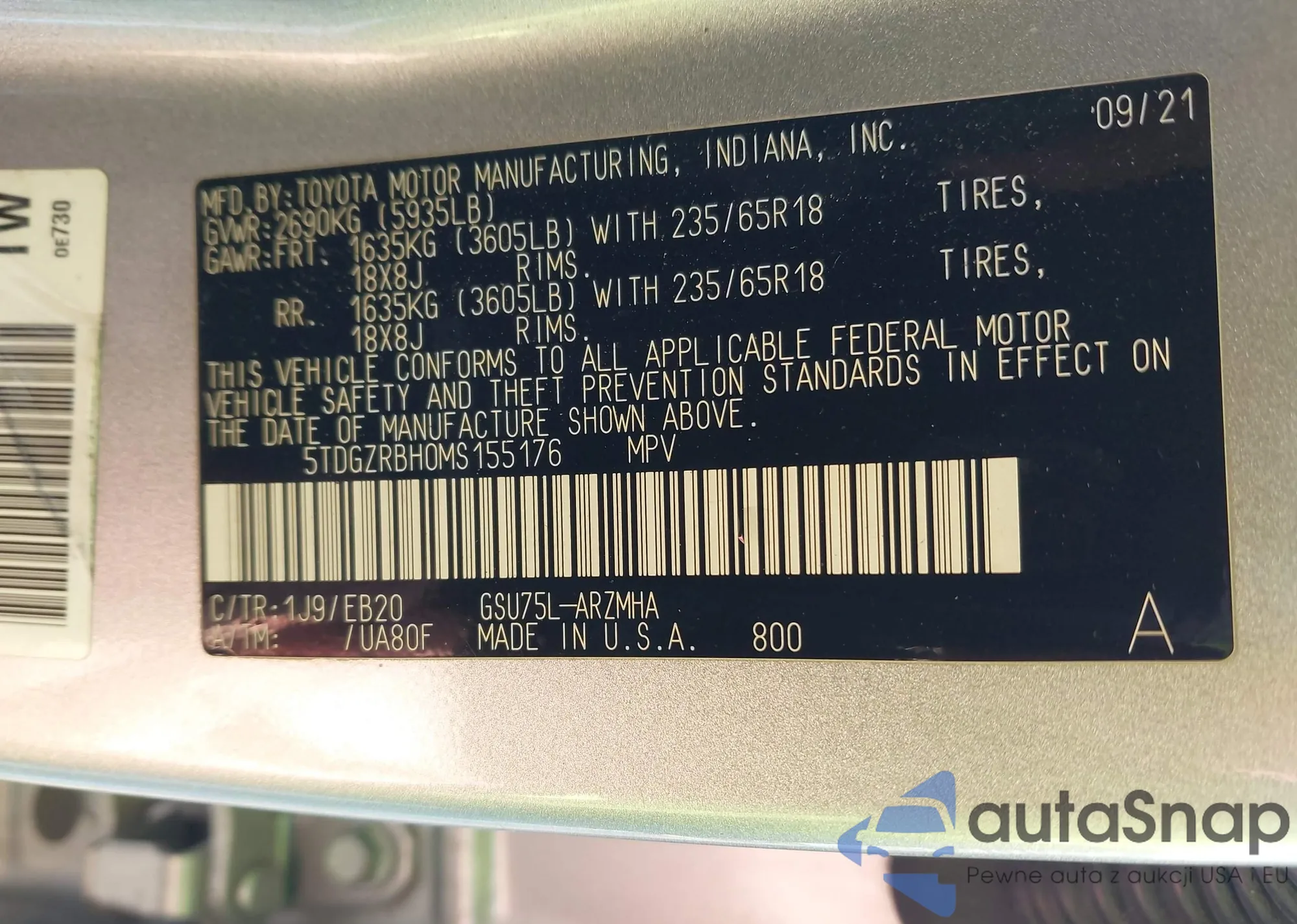 LOT: 43395743 VIN: 5TDGZRBH0MS155176