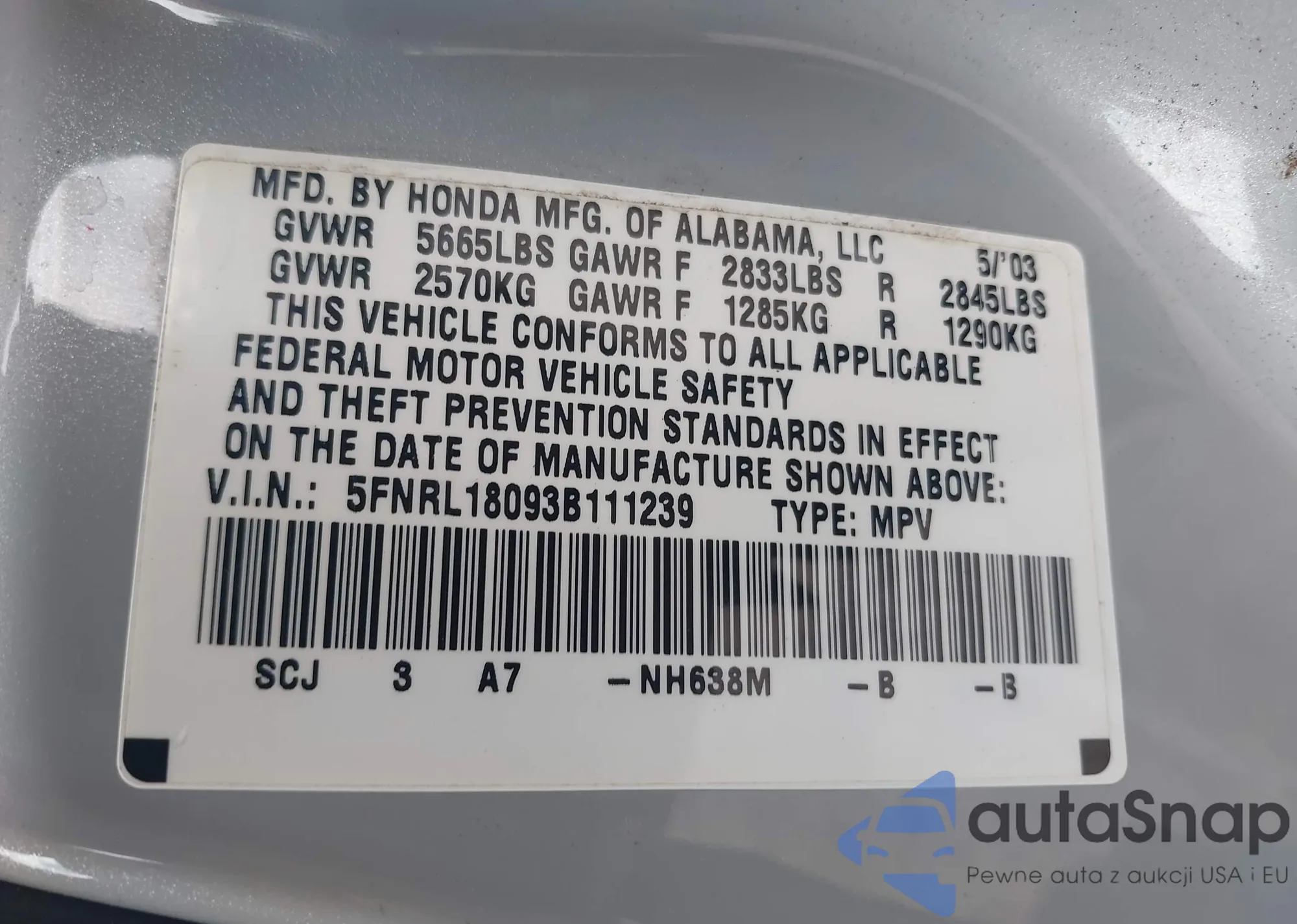 • VIN 2HGFE2F56PH563491