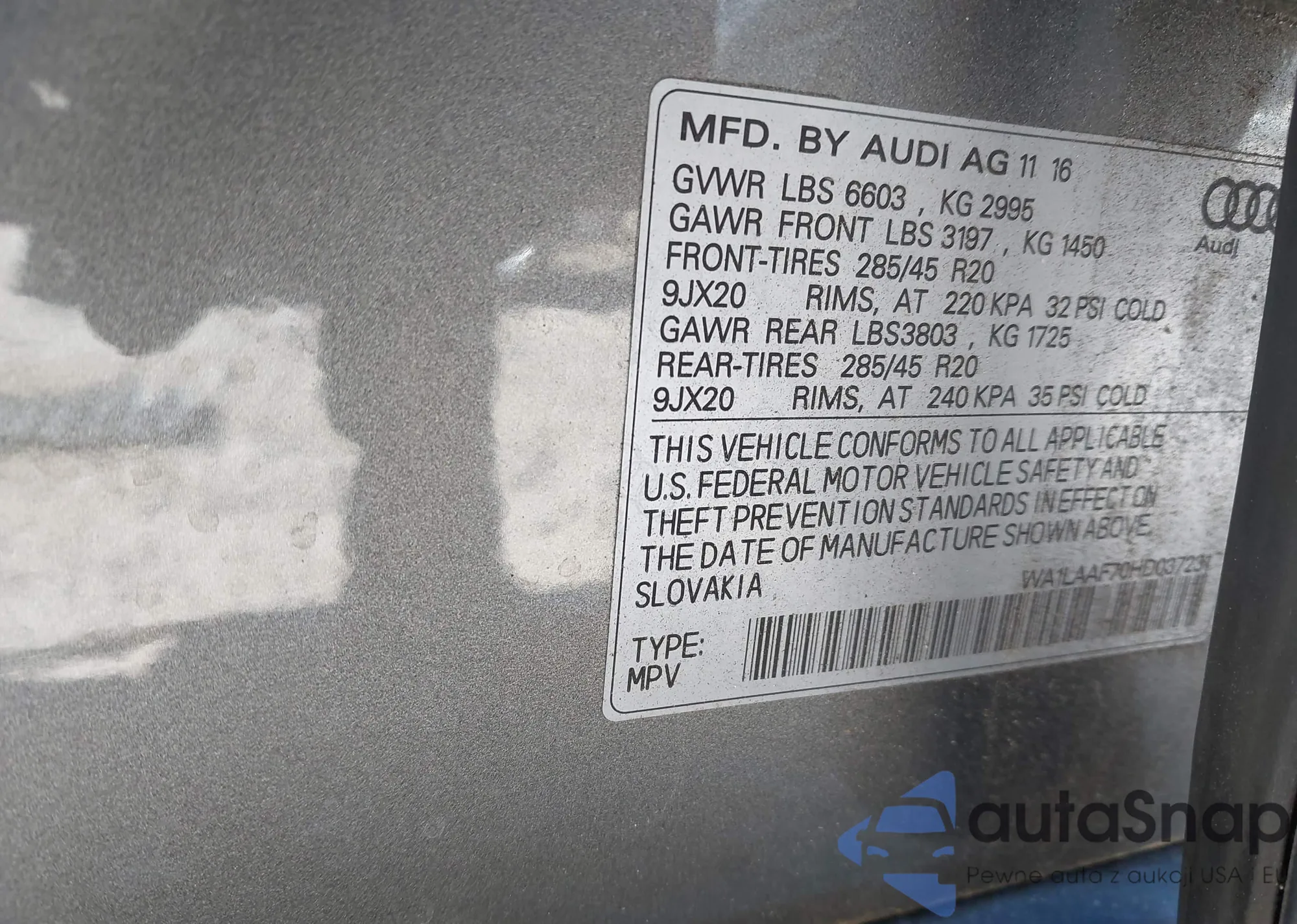 LOT: 43660062 VIN: WA1LAAF70HD037231