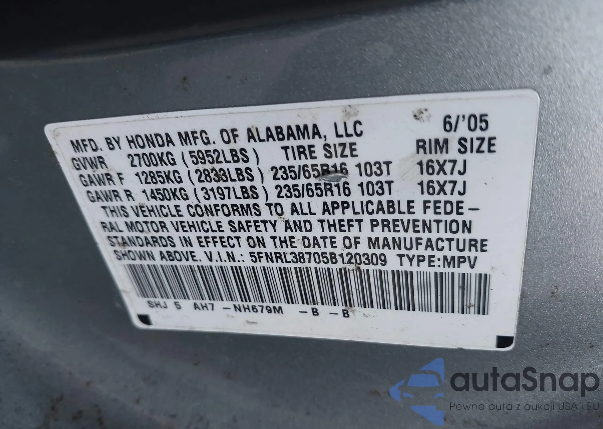 • VIN 5FNRL38705B120309