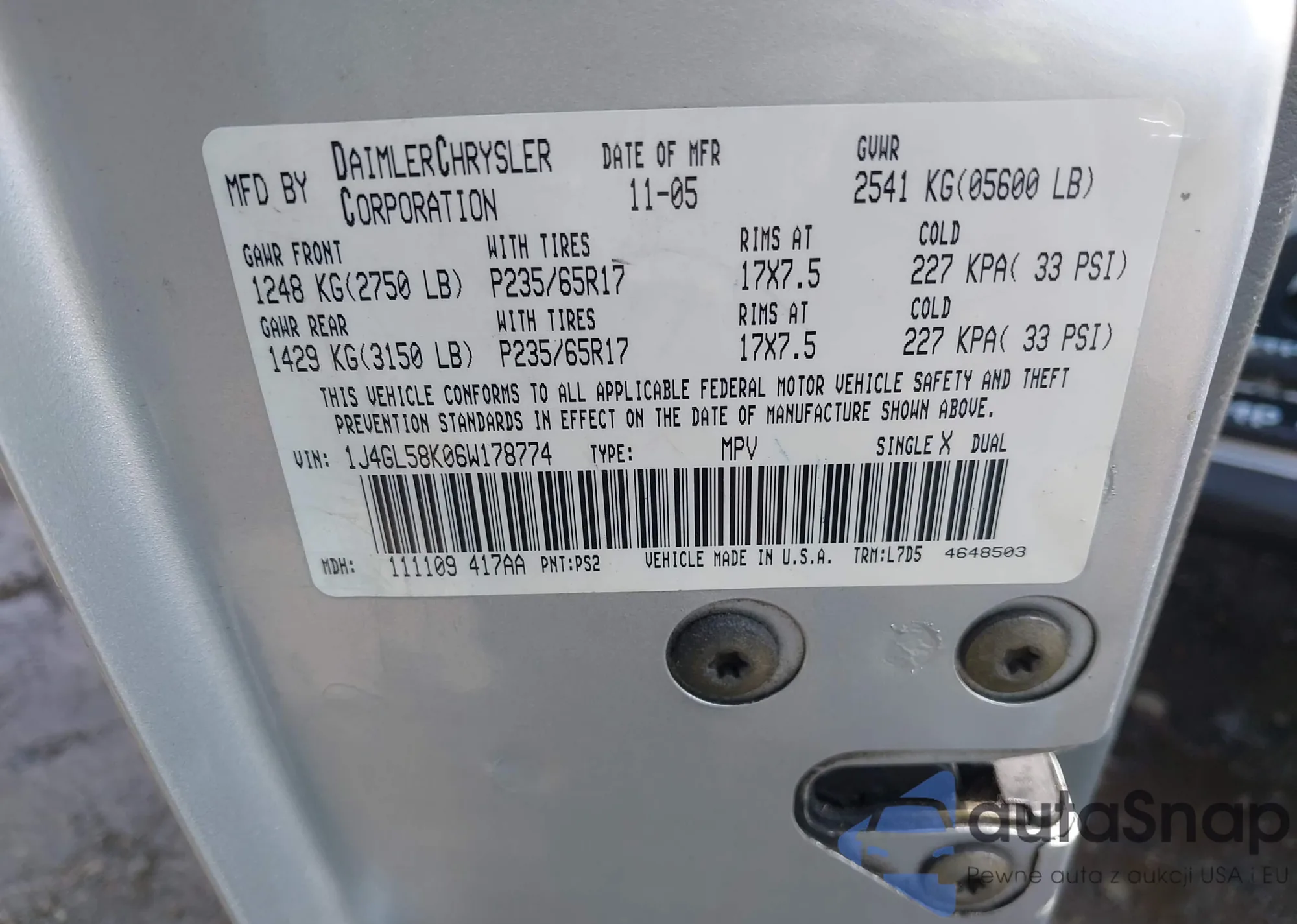 LOT: 43182690 VIN: 1J4GL58K06W178774