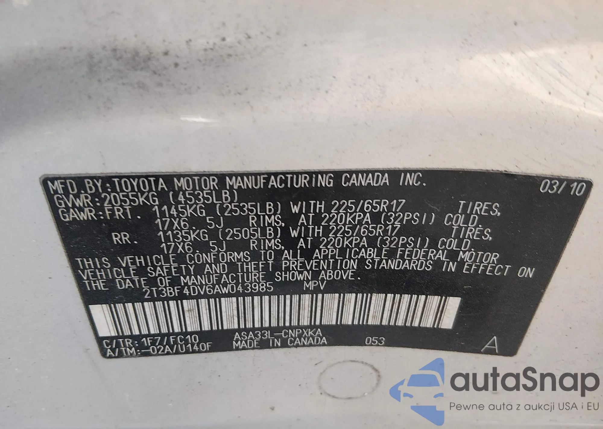 • VIN 2T3BF4DV6AW043985