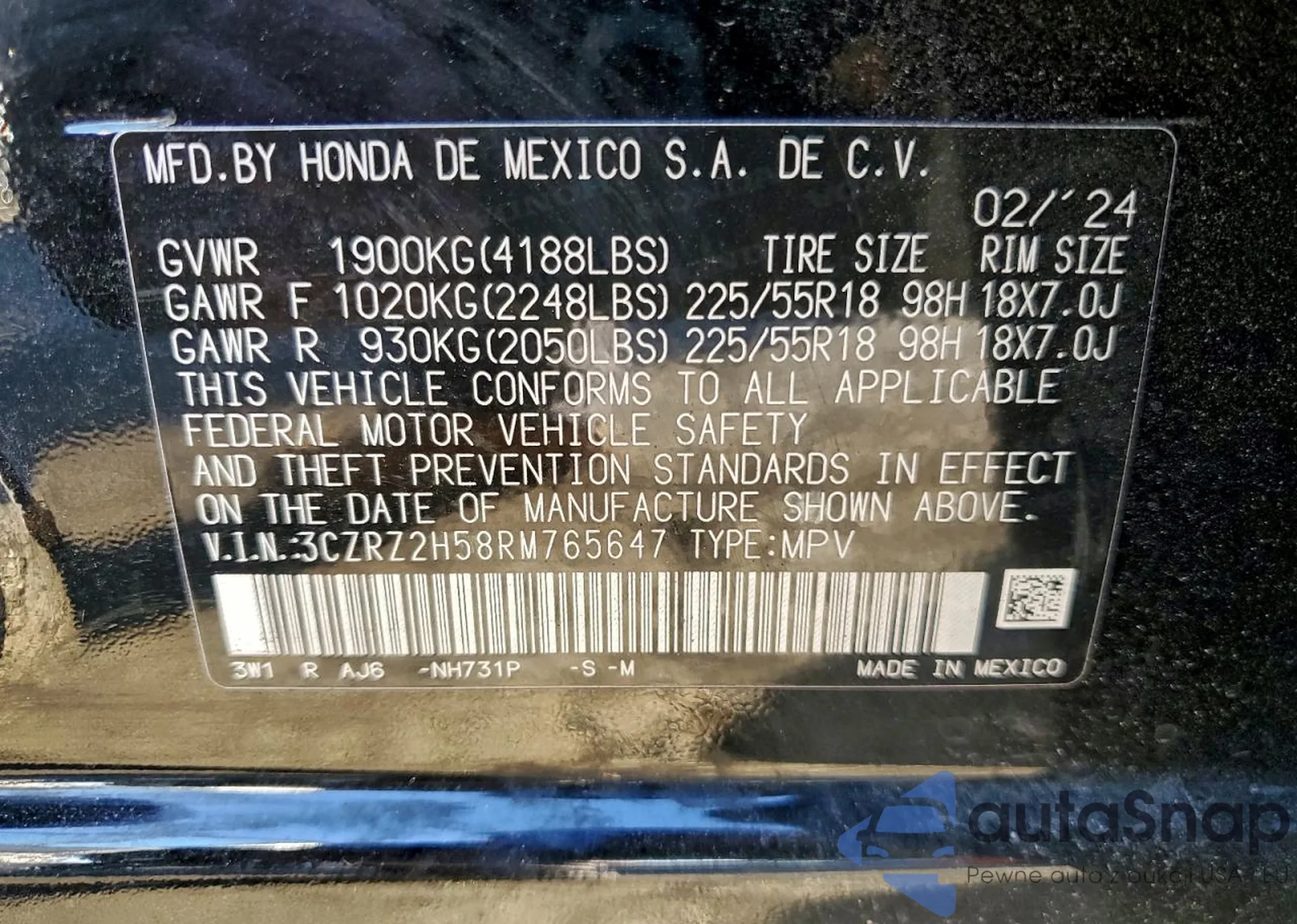 • VIN 3CZRZ2H58RM765647