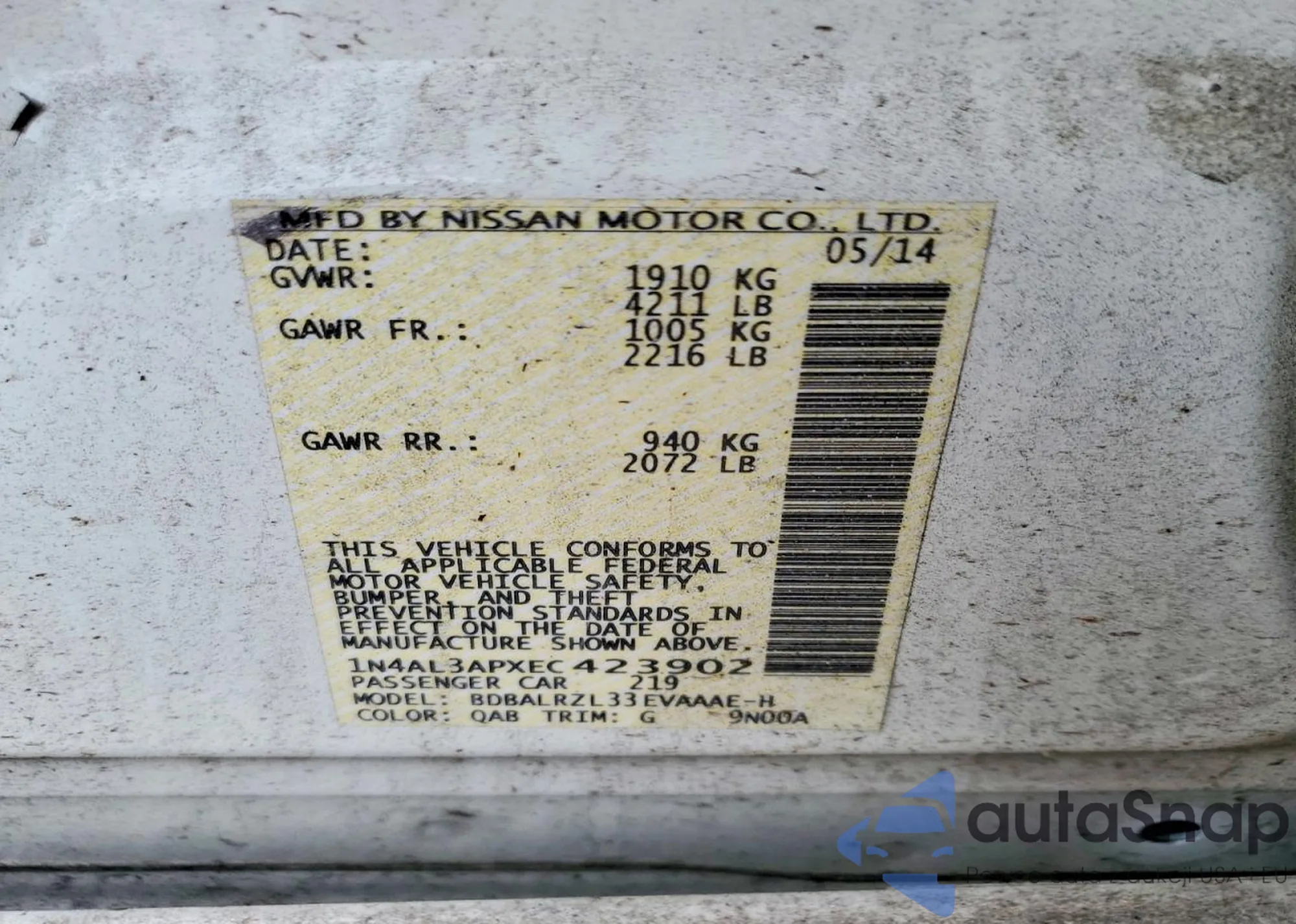 • VIN 1N4AL3APXEC423902