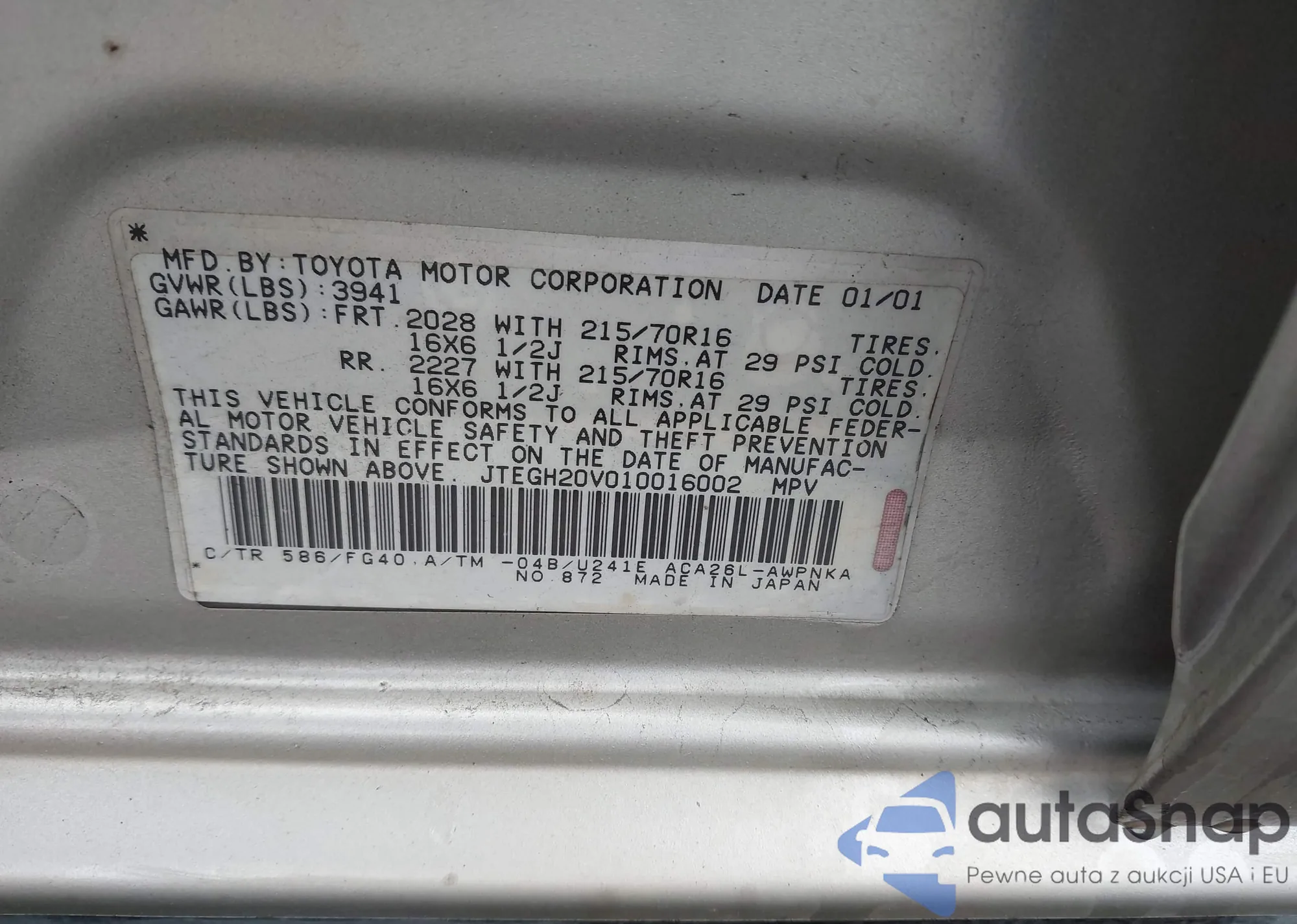 LOT: 43951651 VIN: JTEGH20V010016002