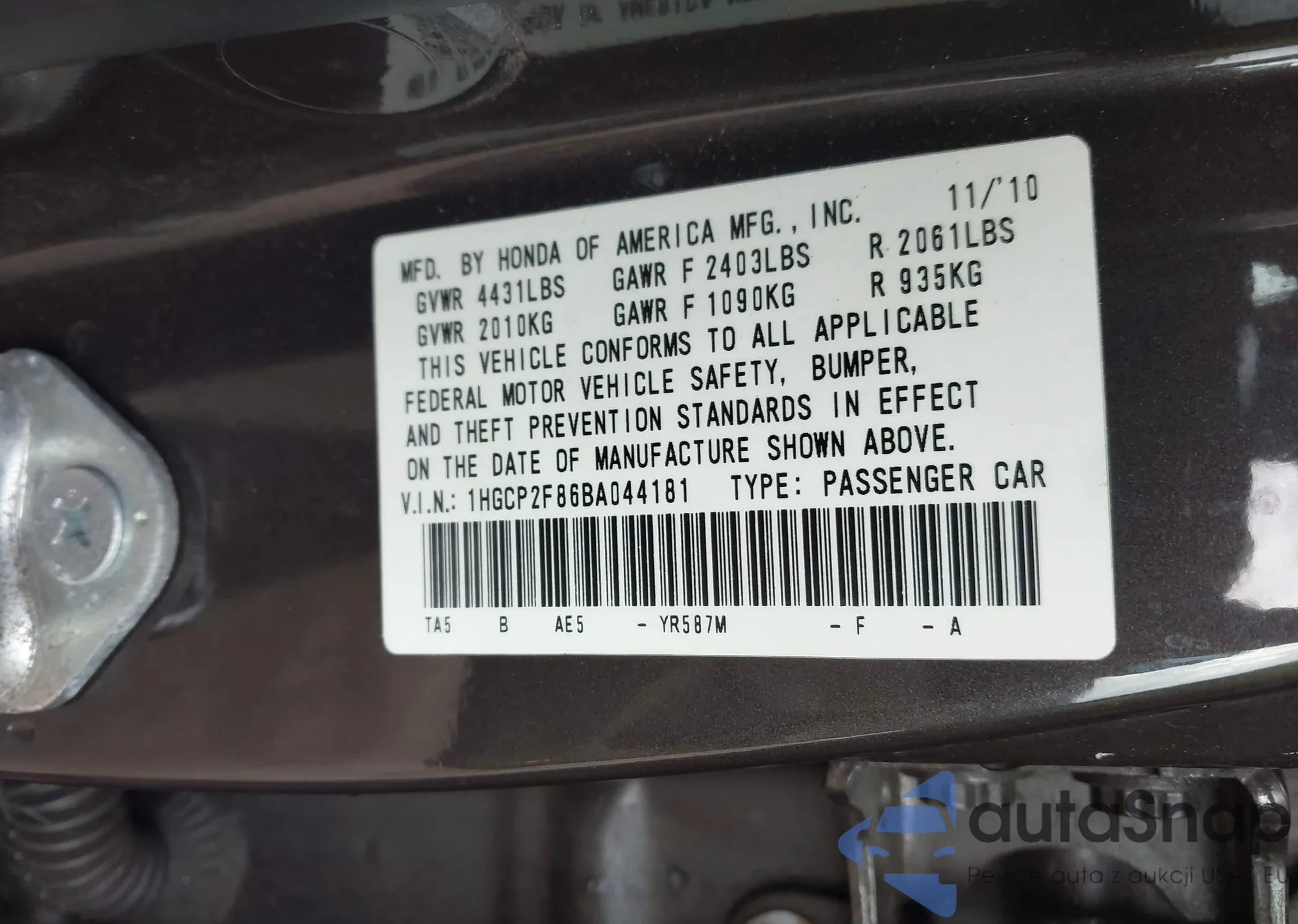 LOT: 43605675 VIN: 1HGCP2F86BA044181