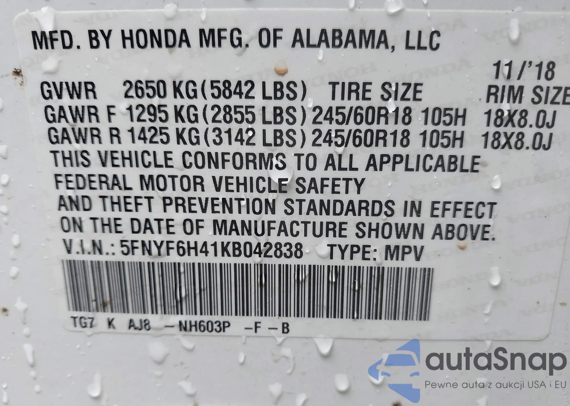 • VIN 5FNYF6H41KB042838