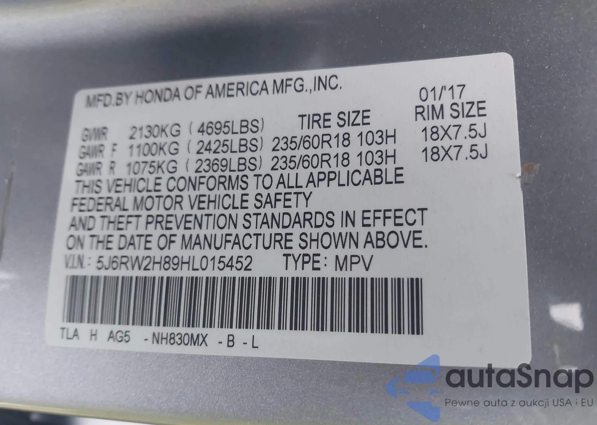 • VIN 5J6RW2H89HL015452