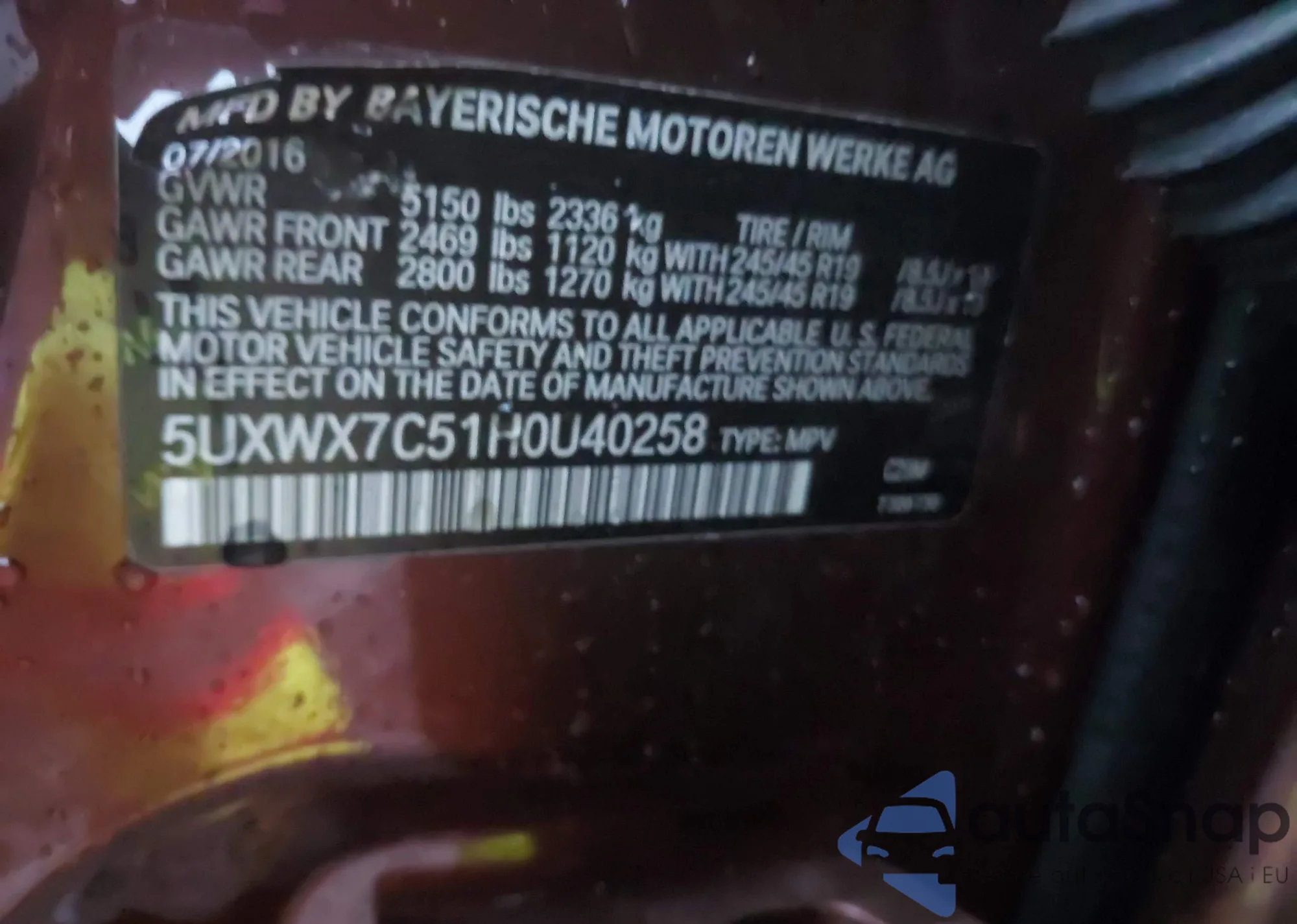 LOT: 43952956 VIN: 5UXWX7C51H0U40258