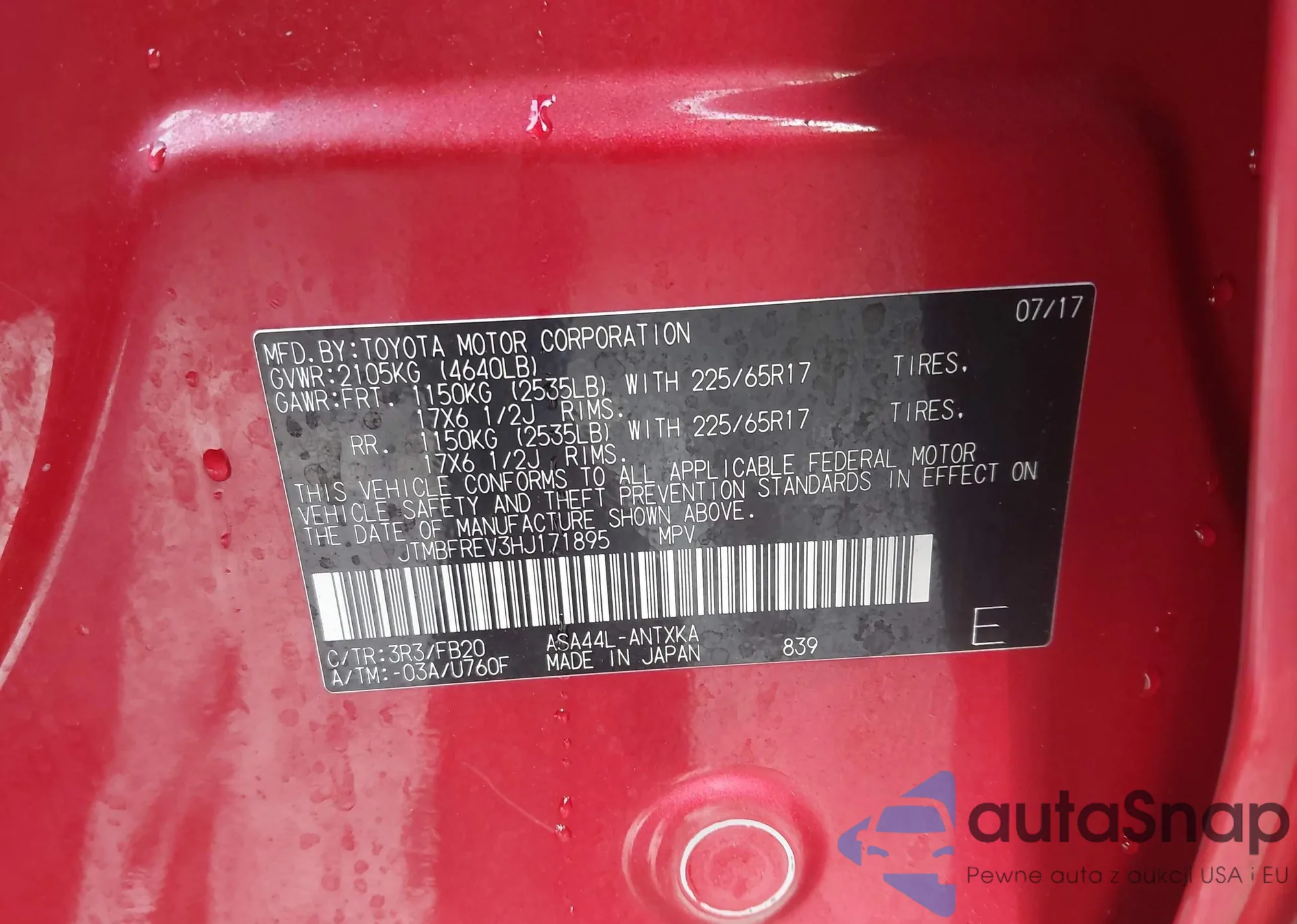 LOT: 43967150 VIN: JTMBFREV3HJ171895
