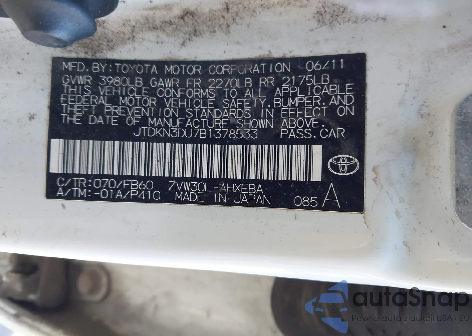 LOT: 44172597 VIN: JTDKN3DU7B1378533