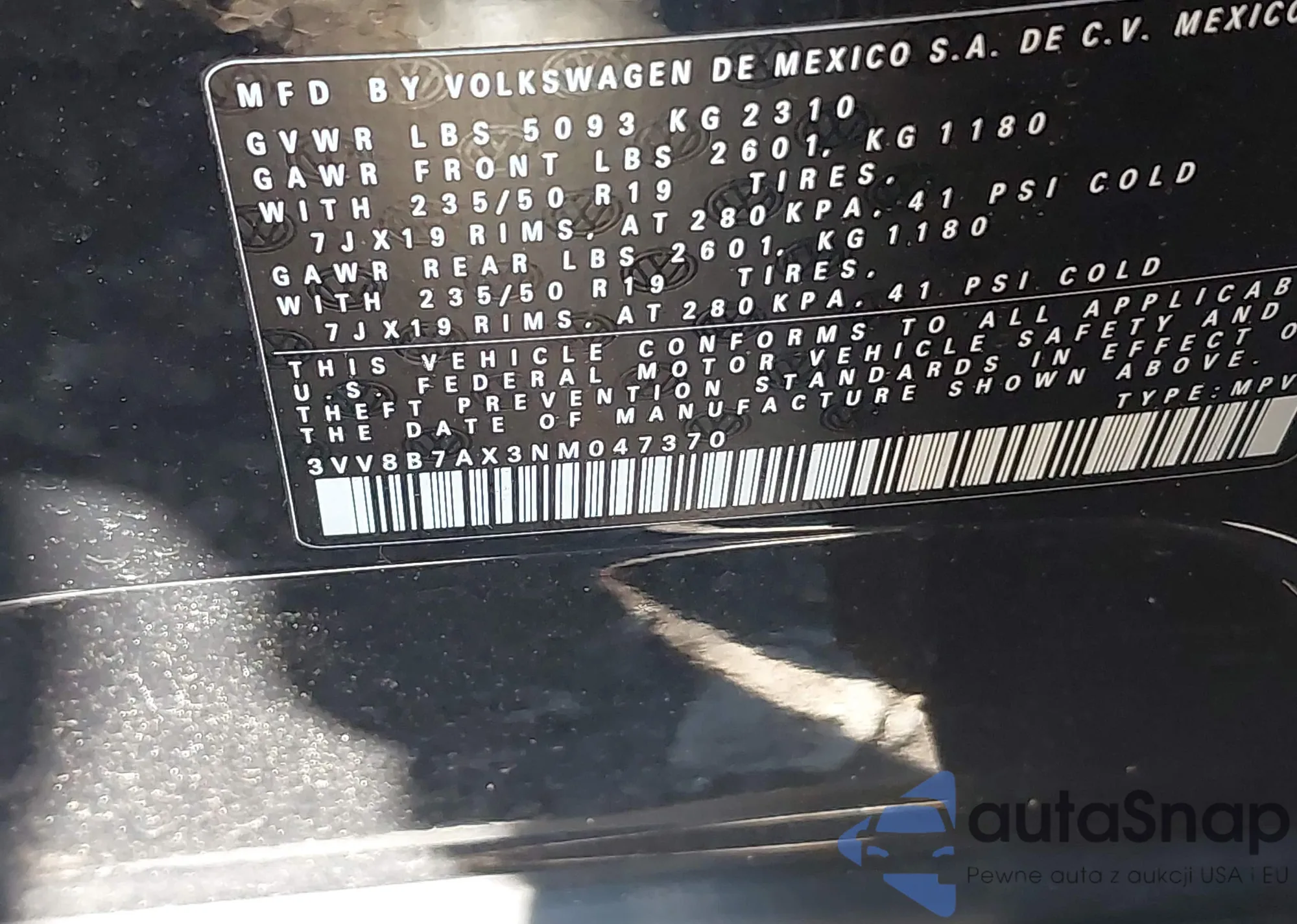 • VIN 3VV8B7AX3NM047370