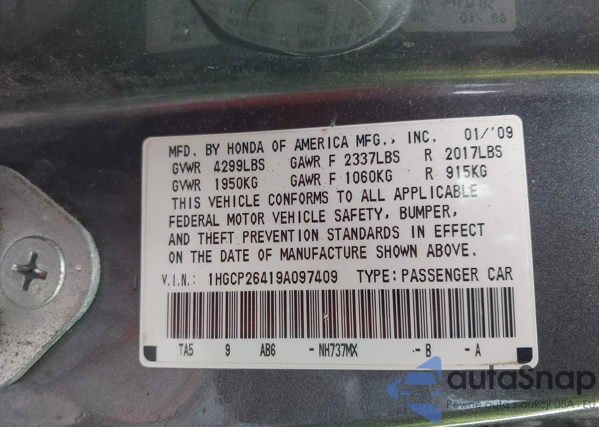 LOT: 44207035 VIN: 1HGCP26419A097409