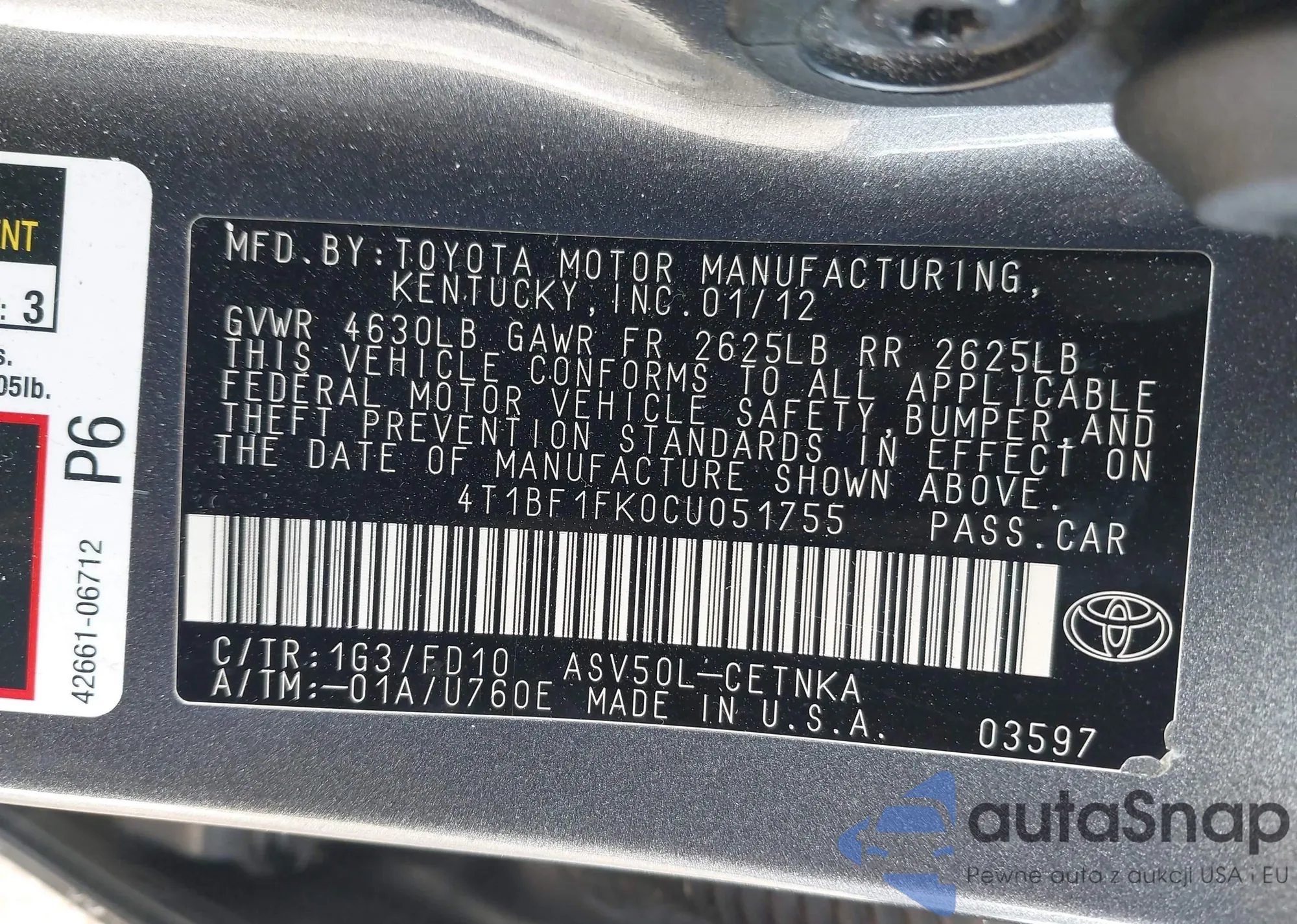 • VIN 4T1BF1FK0CU051755