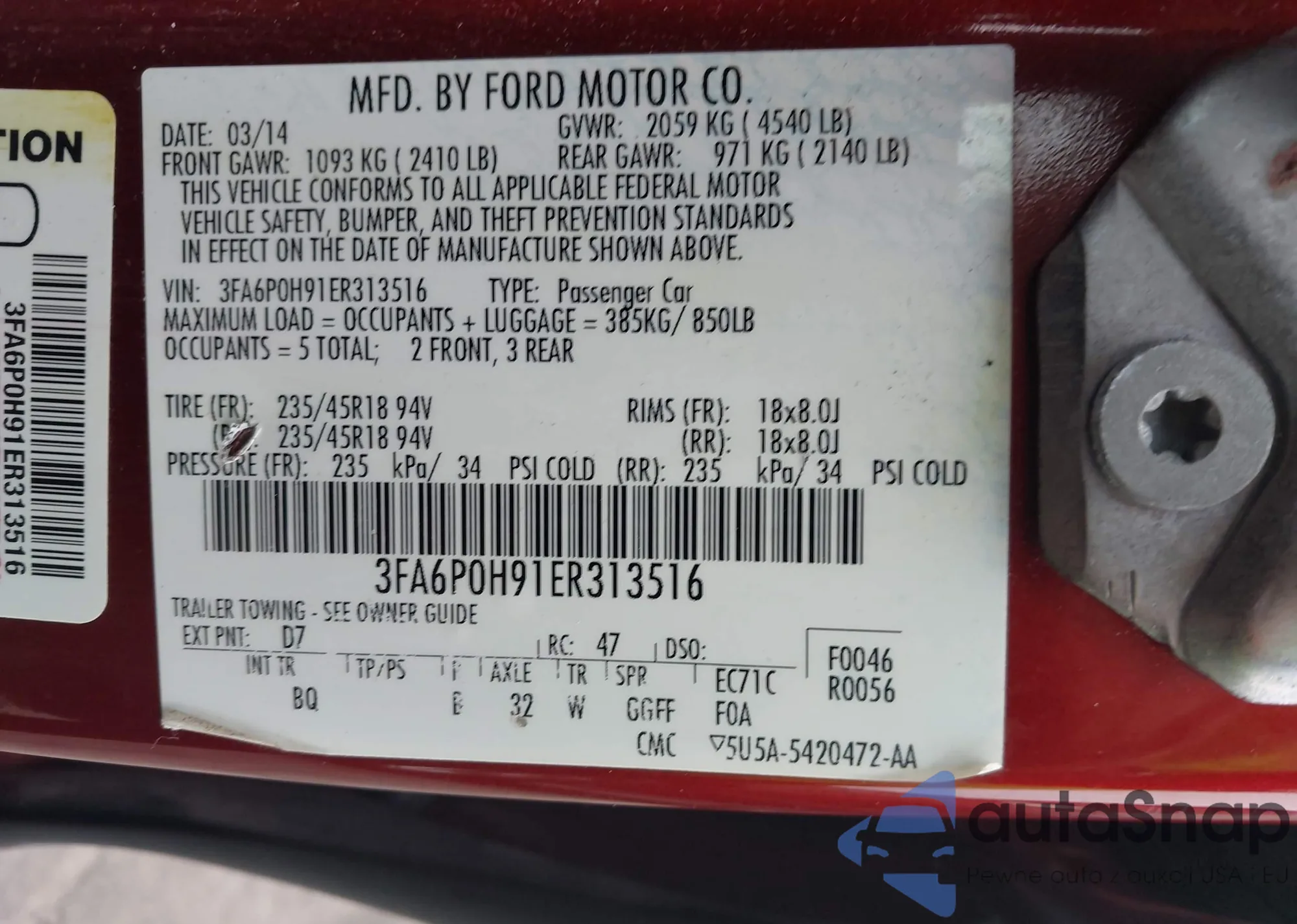 LOT: 44128076 VIN: 3FA6P0H91ER313516