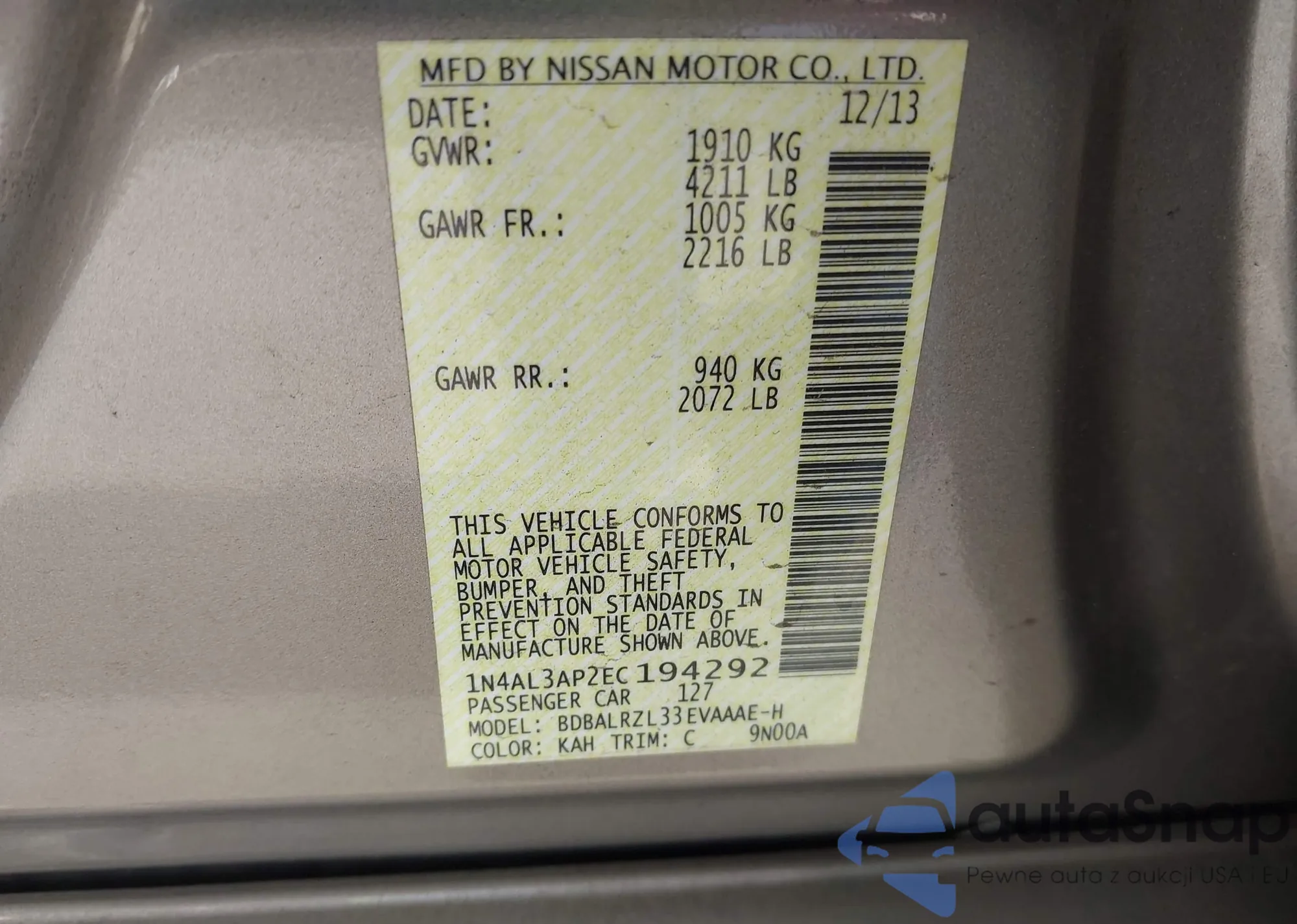 LOT: 44143392 VIN: 1N4AL3AP2EC194292