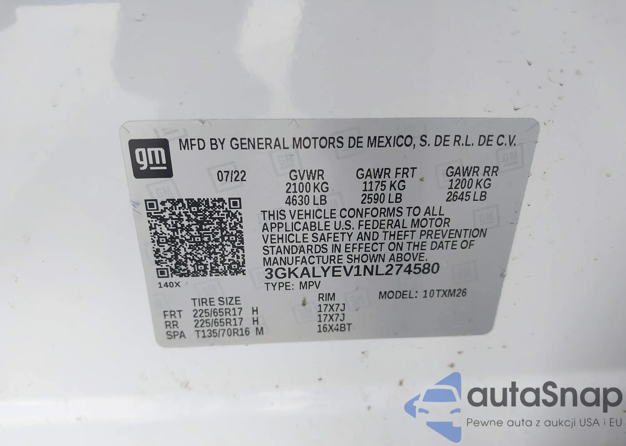 • VIN 3GKALYEV1NL274580