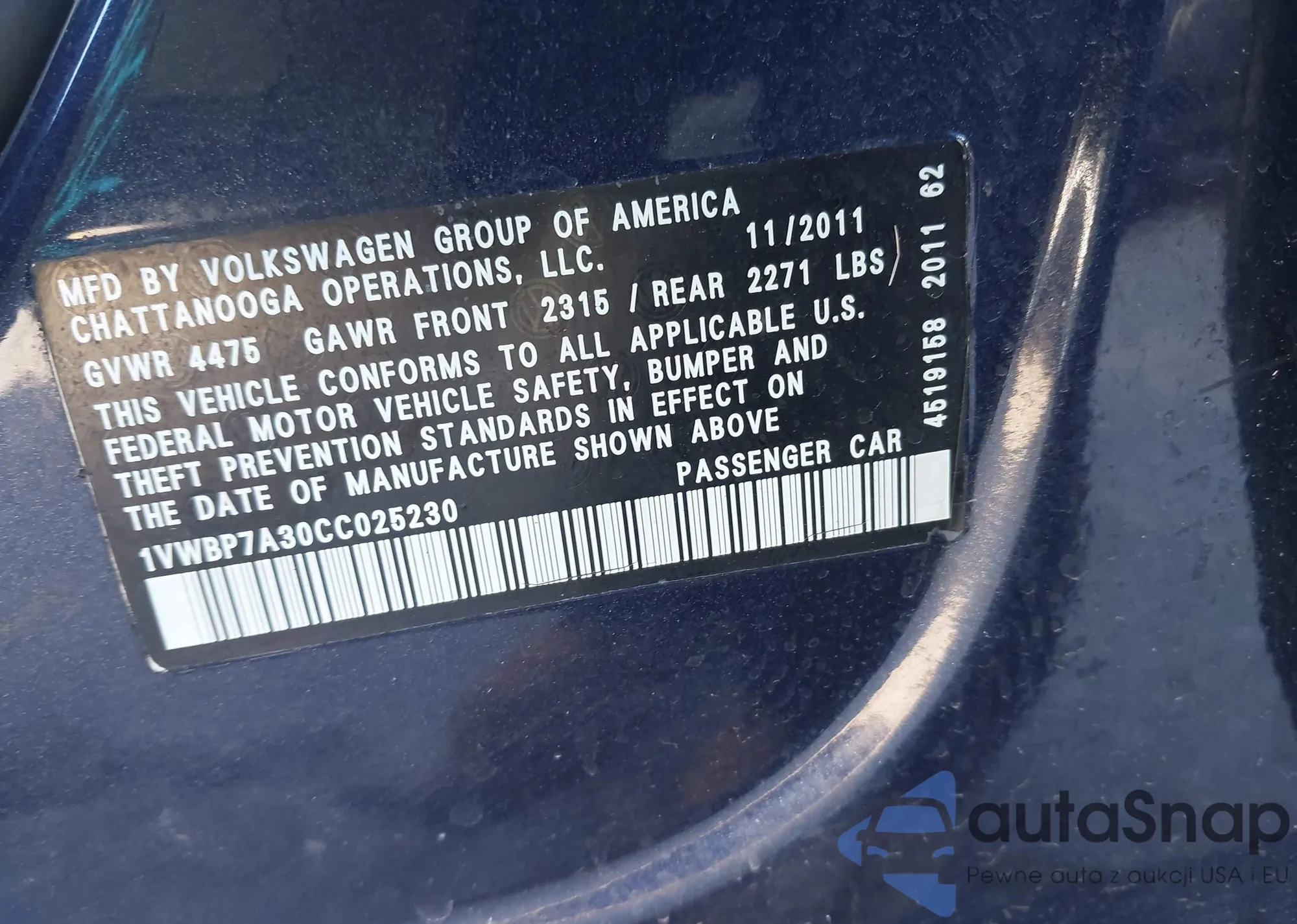 • VIN 1VWBP7A30CC025230