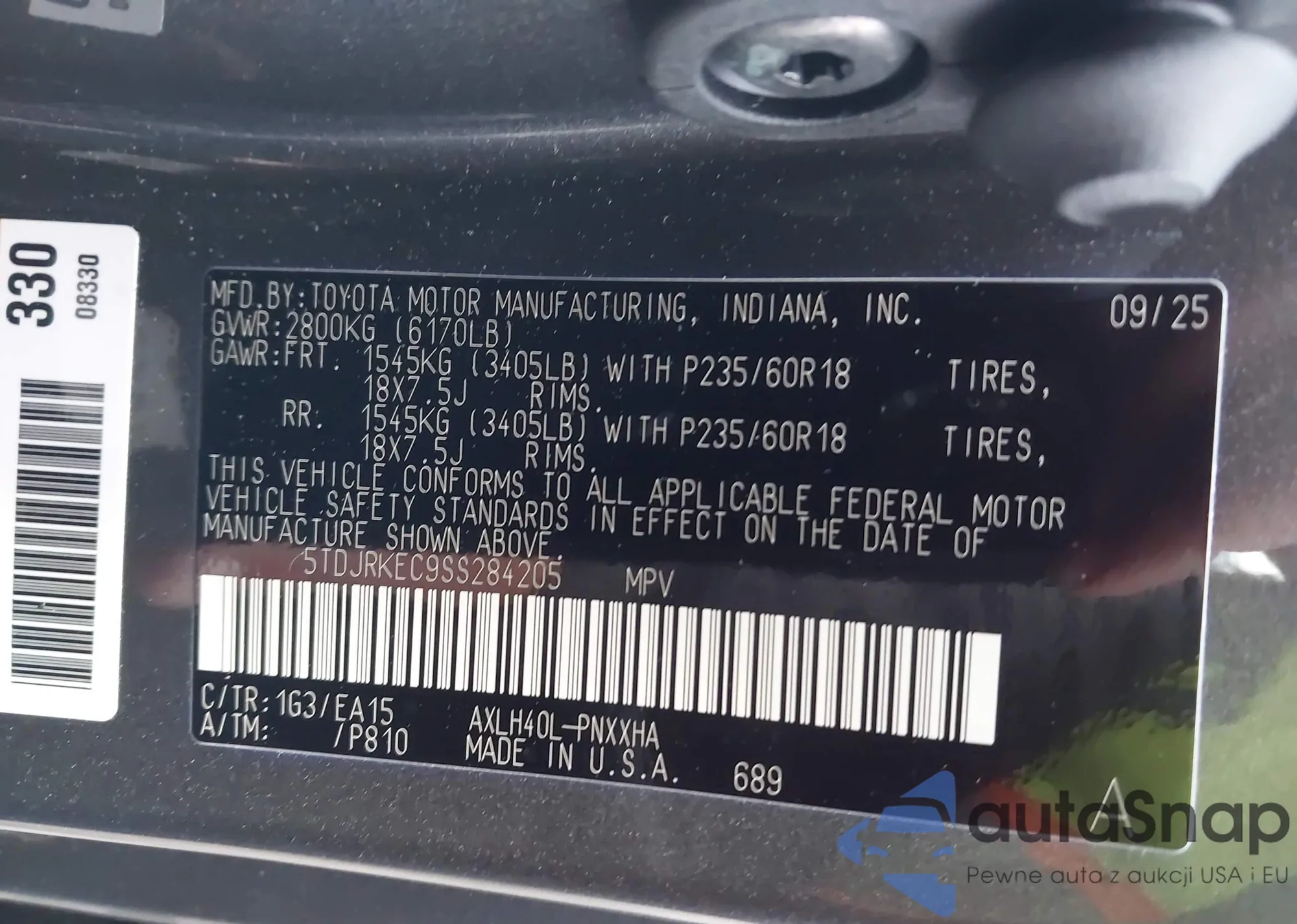 • VIN 5TDJRKEC9SS284205