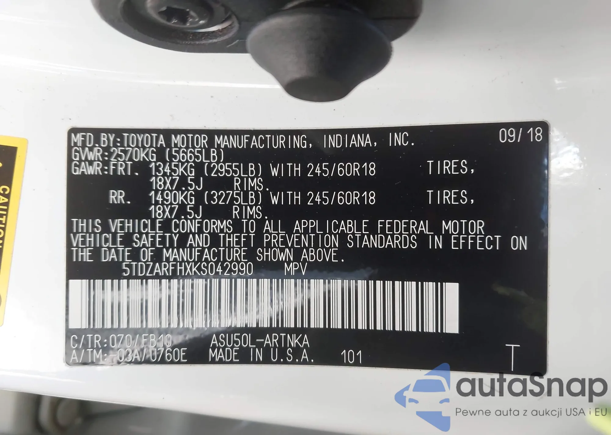 LOT: 44257860 VIN: 5TDZARFHXKS042990