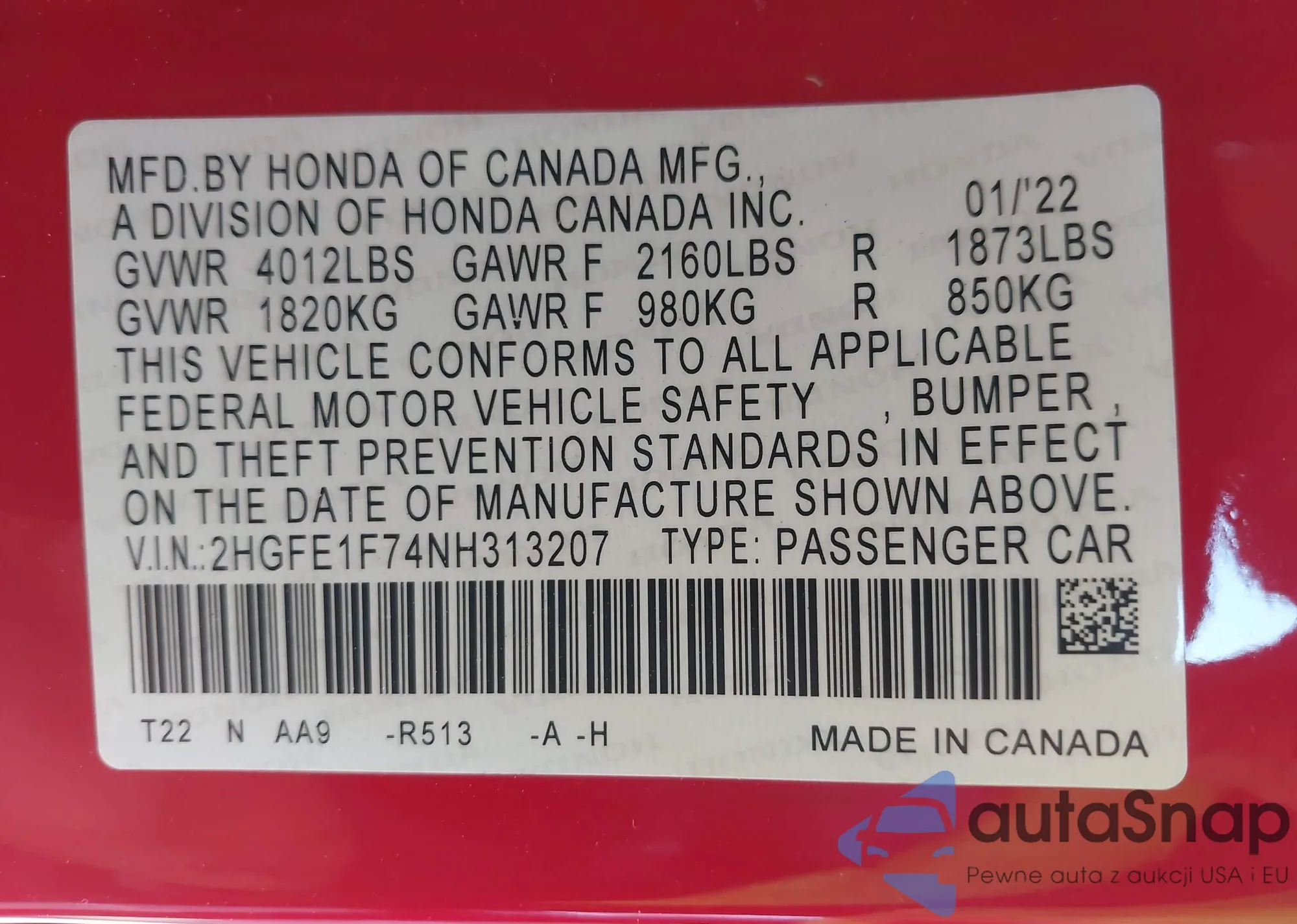 • VIN 2HGFE1F74NH313207
