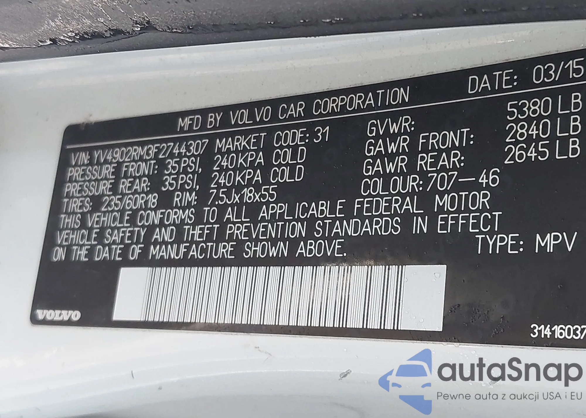 LOT: 44092742 VIN: YV4902RM3F2744307