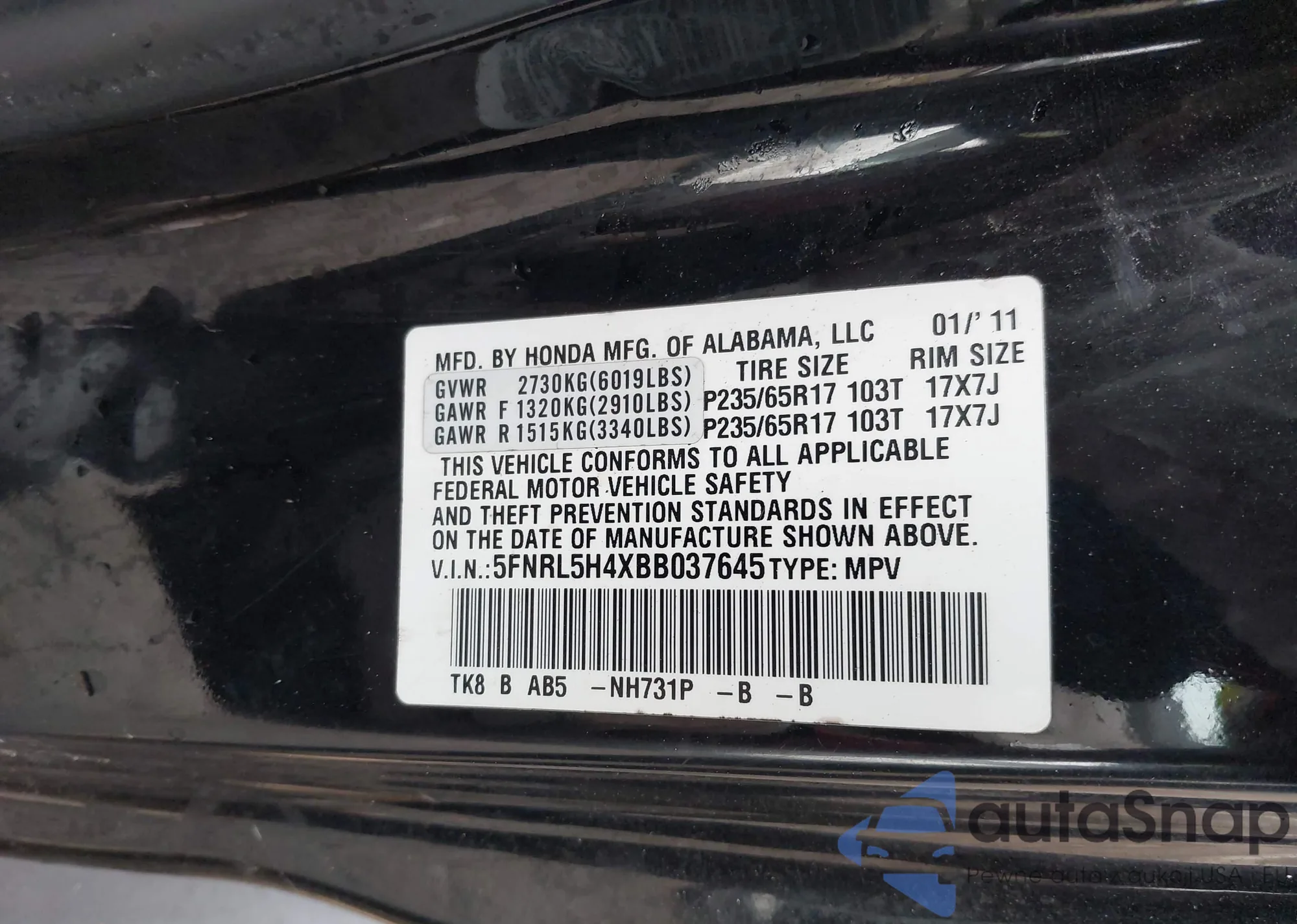 • VIN 5FNRL5H4XBB037645