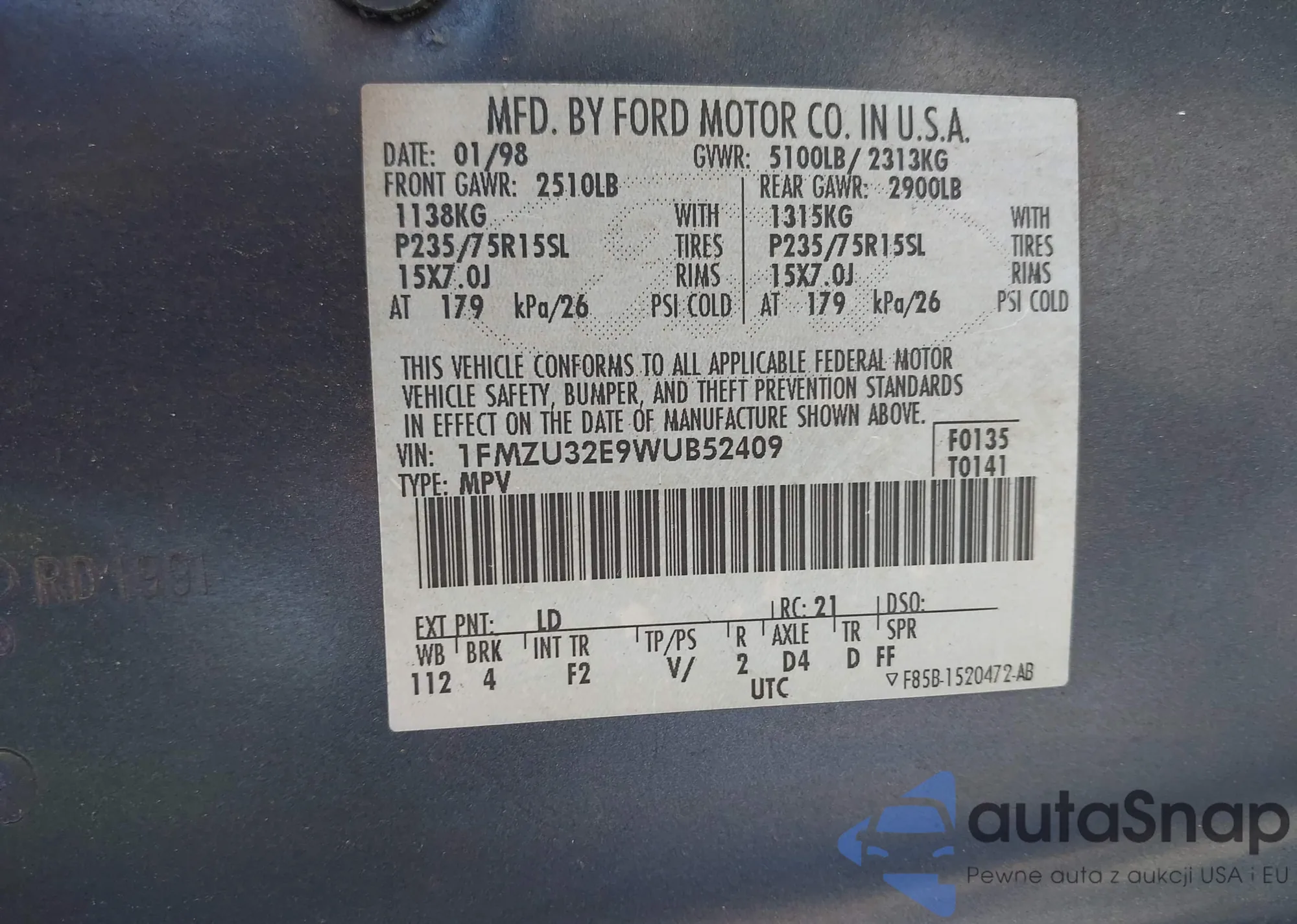 • VIN 1FMZU32E9WUB52409