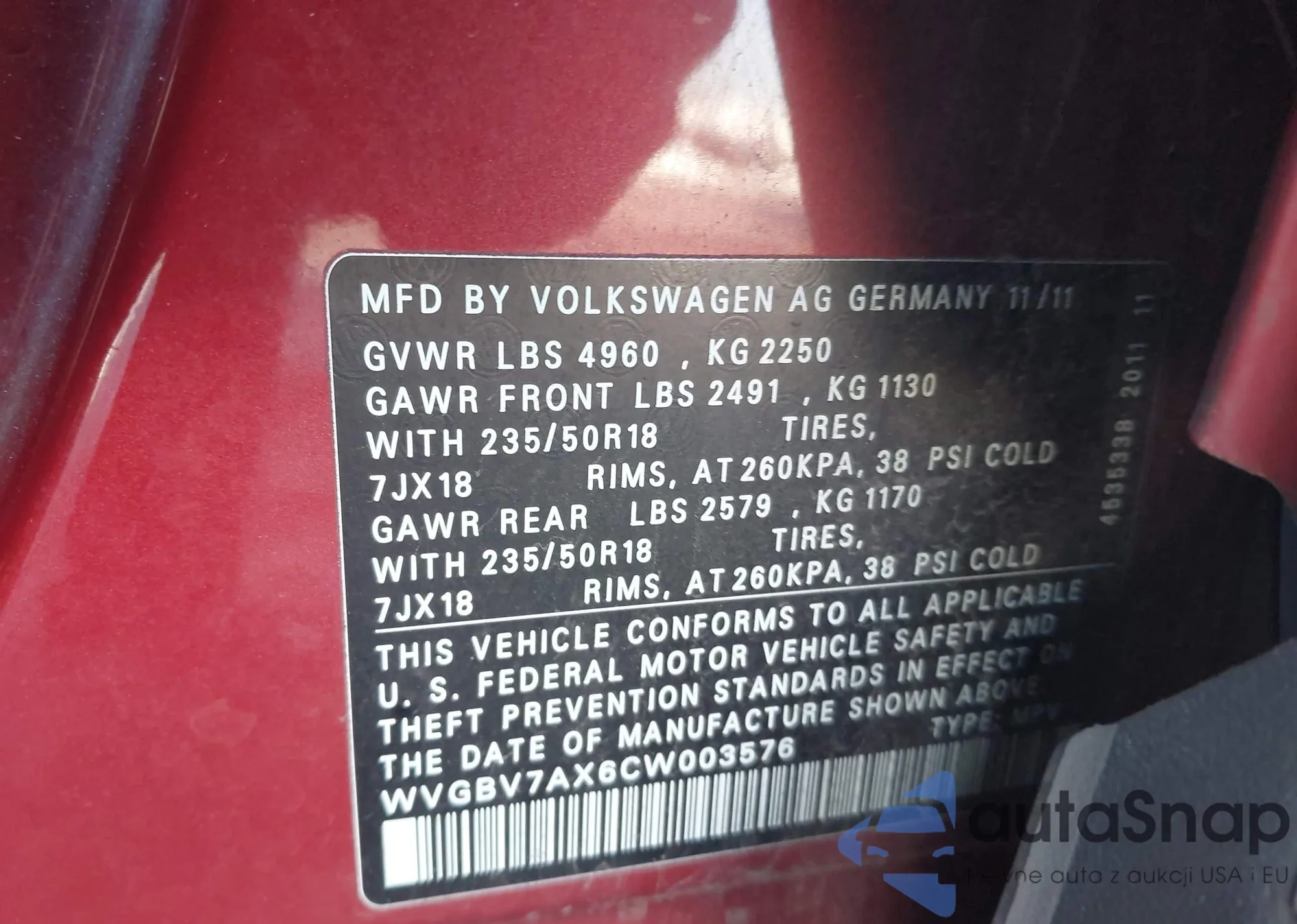LOT: 43808699 VIN: 1VWMA7A30KC000949