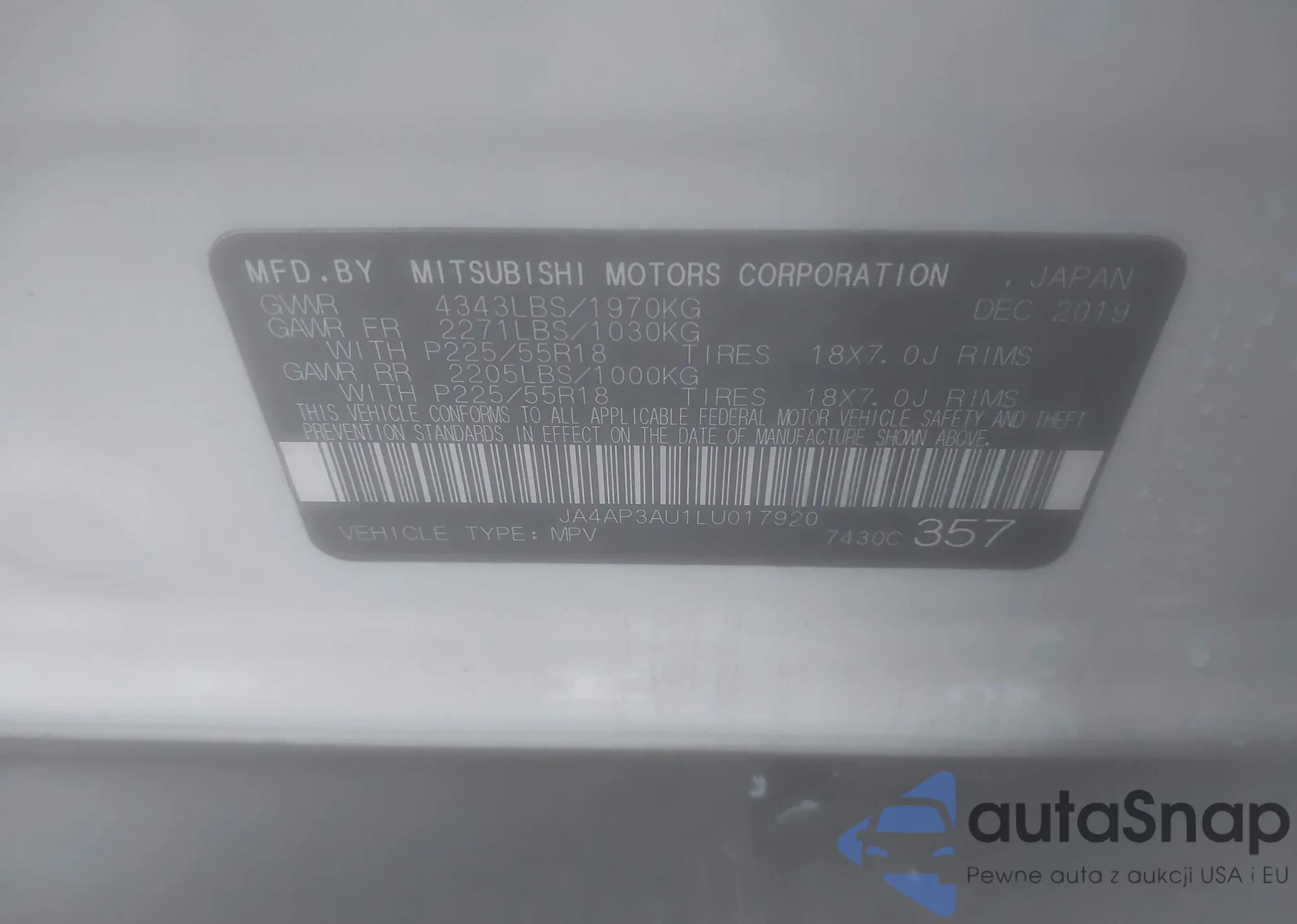 LOT: 43825823 VIN: JA4AP3AU1LU017920