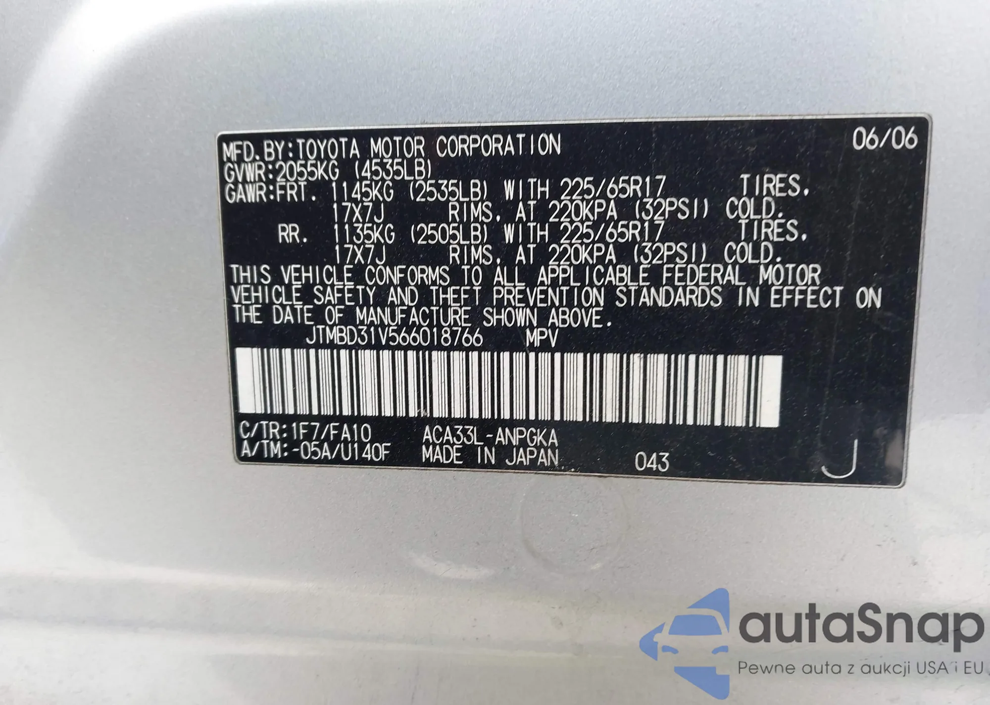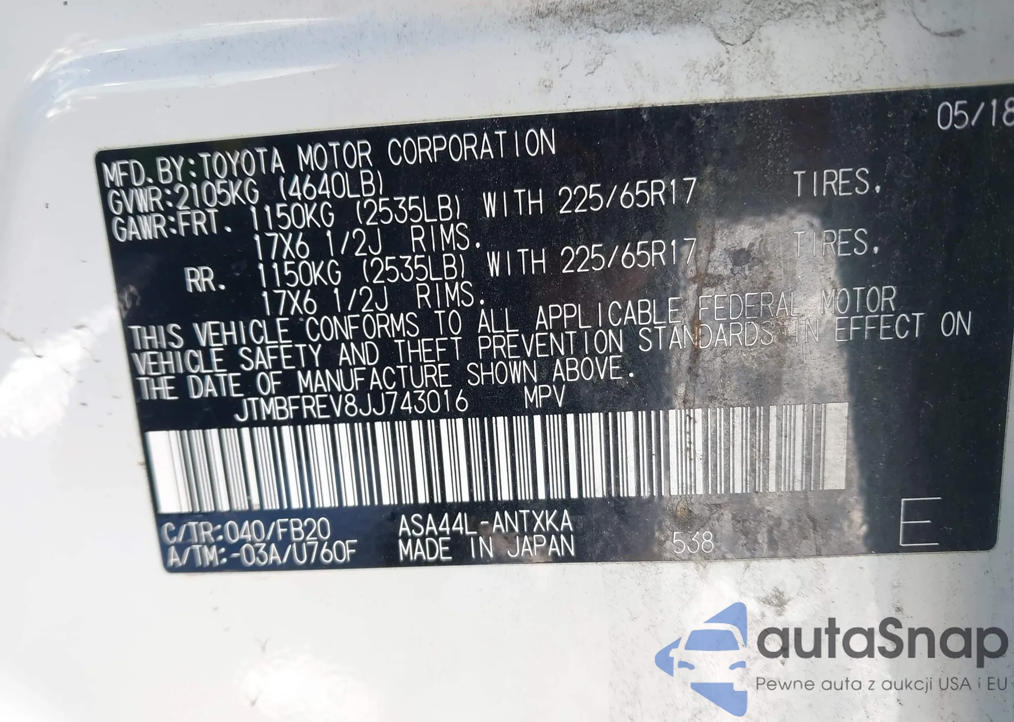 LOT: 43997840 VIN: JTMBFREV8JJ743016