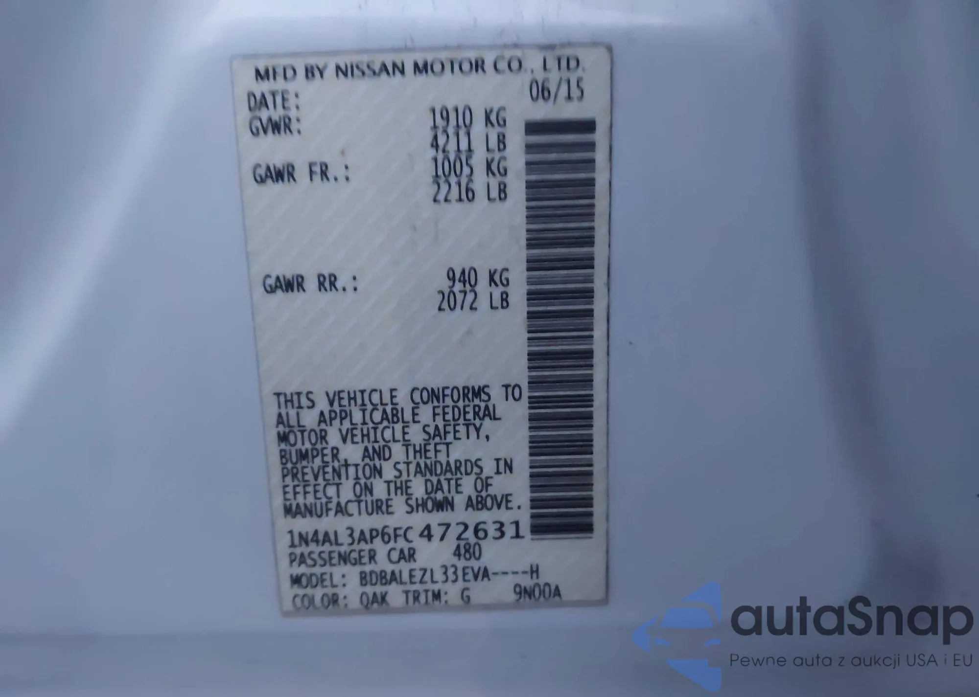 • VIN 1N4AL3AP6FC472631