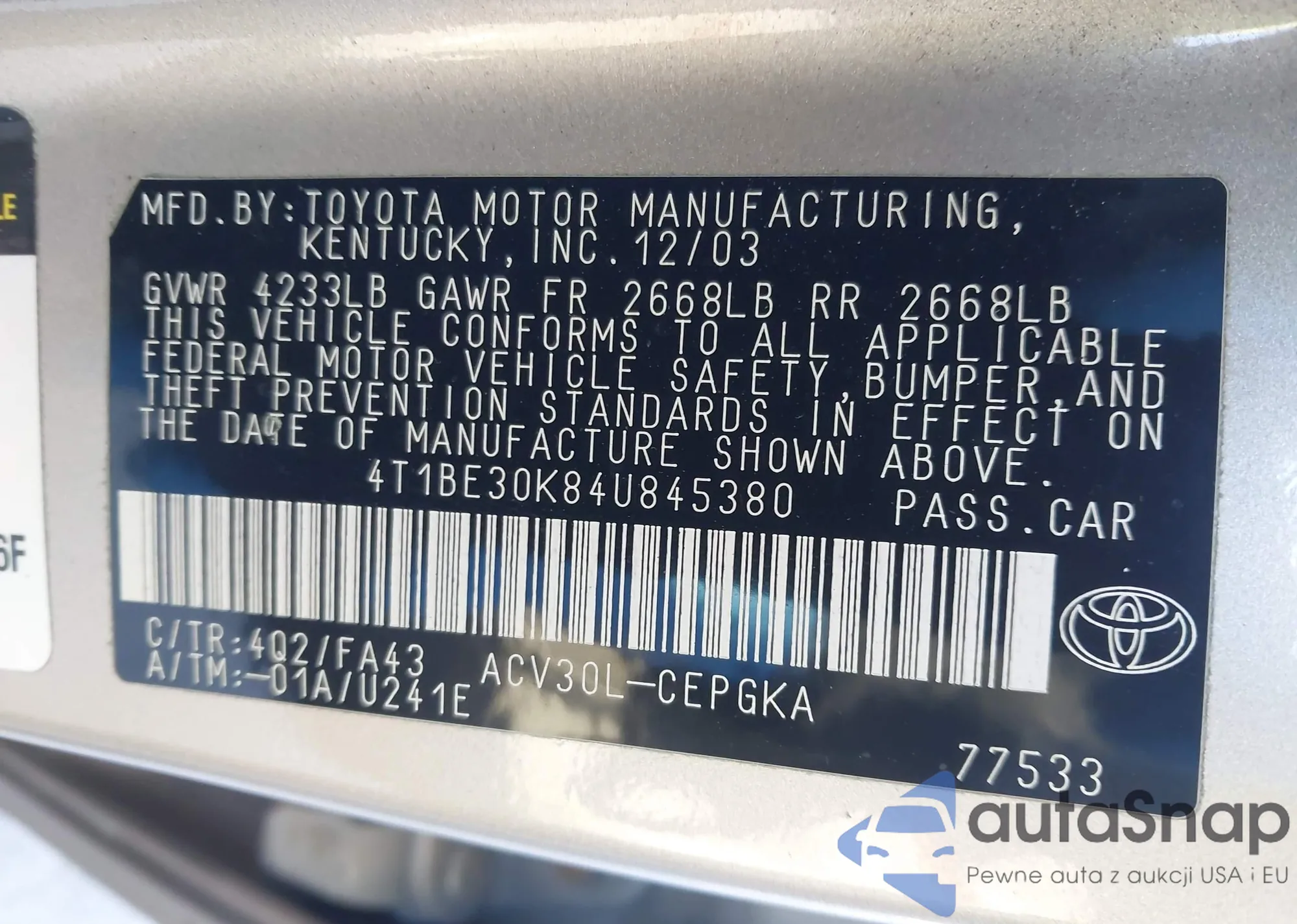• VIN 4T1BE30K84U845380