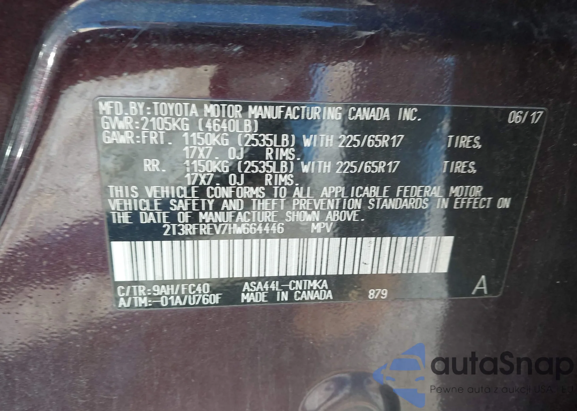 • VIN 2T3RFREV7HW664446