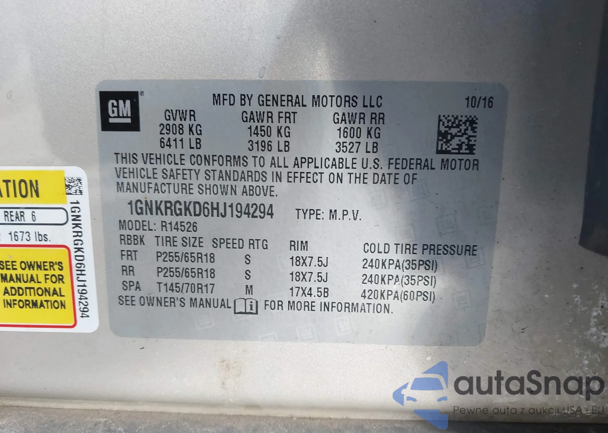 LOT: 43897143 VIN: 1GNKRGKD6HJ194294