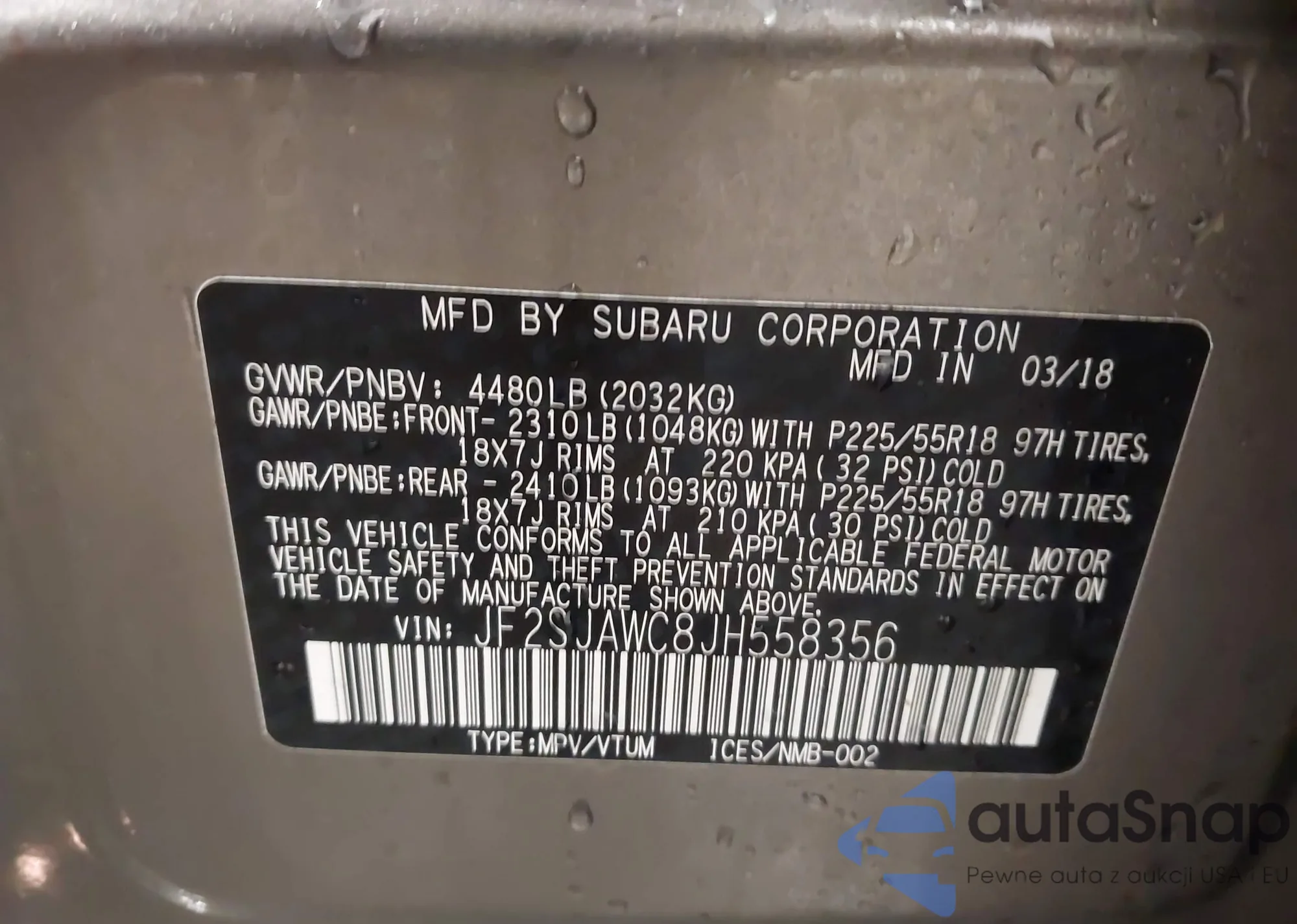 • VIN JF2SJAWC8JH558356