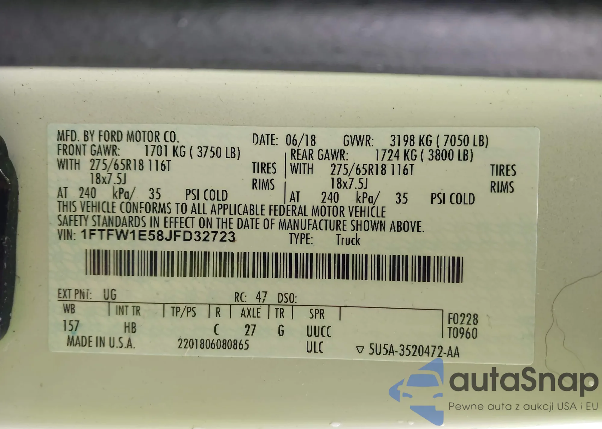 LOT: 43820334 VIN: 1FTFW1E58JFD32723