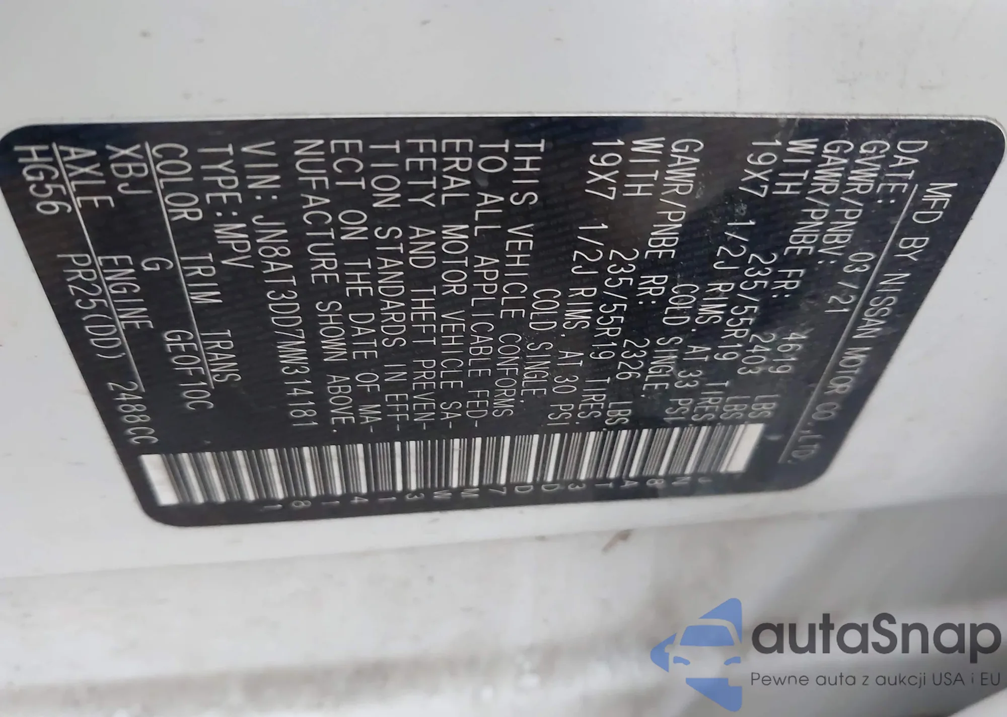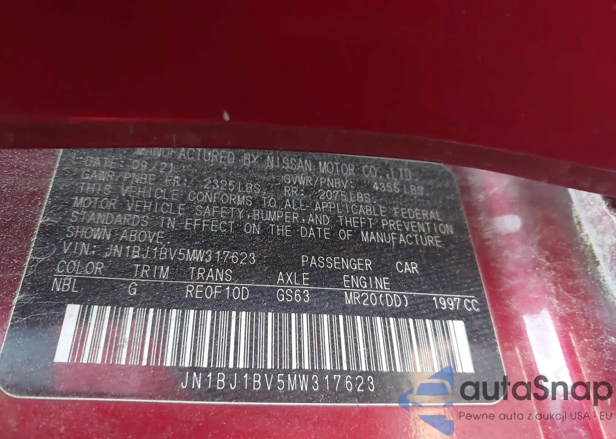 LOT: 43461033 VIN: JN1BJ1BV5MW317623