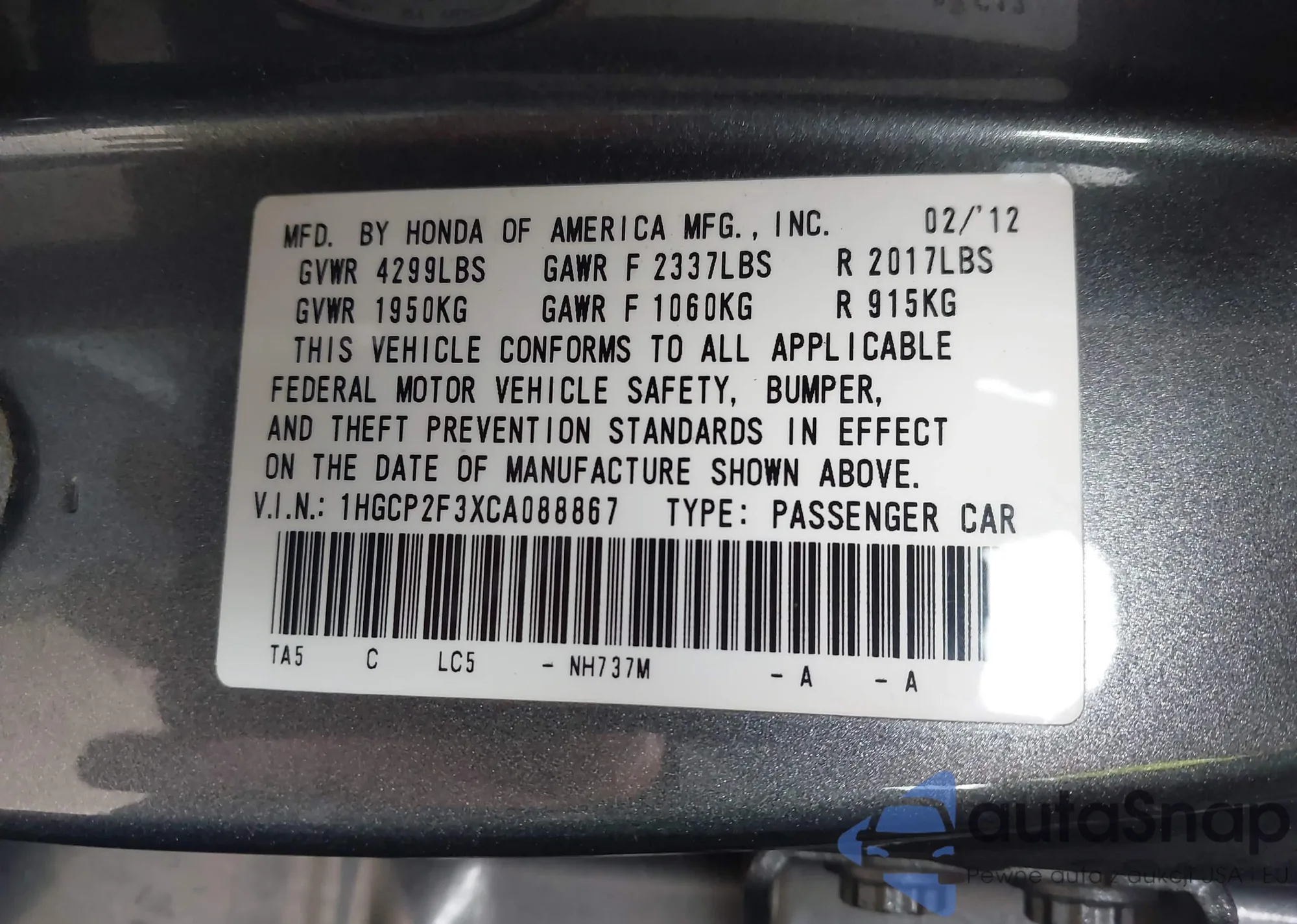 LOT: 44115661 VIN: 1HGCP2F3XCA088867
