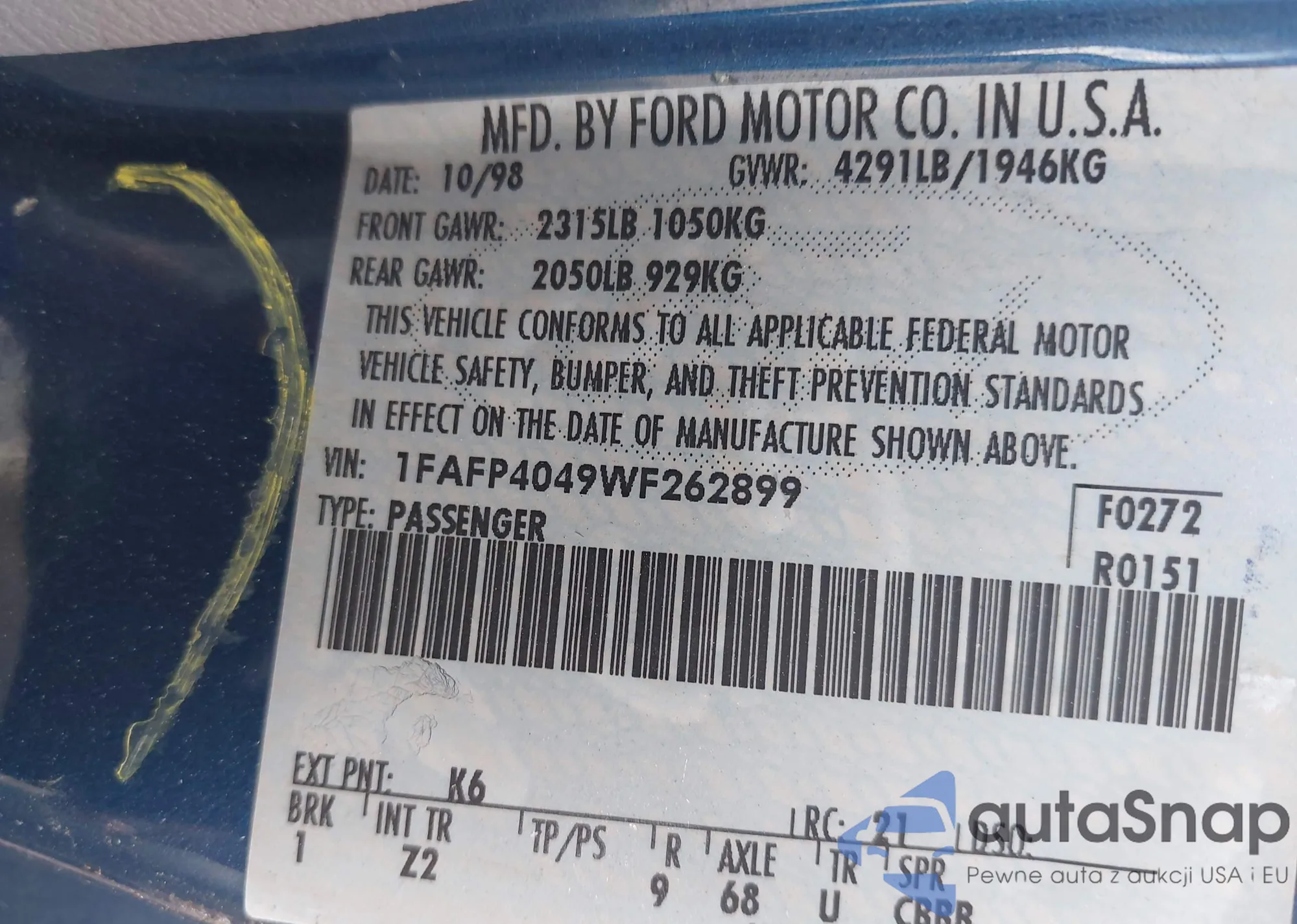 LOT: 42868387 VIN: 1FAFP4049WF262899