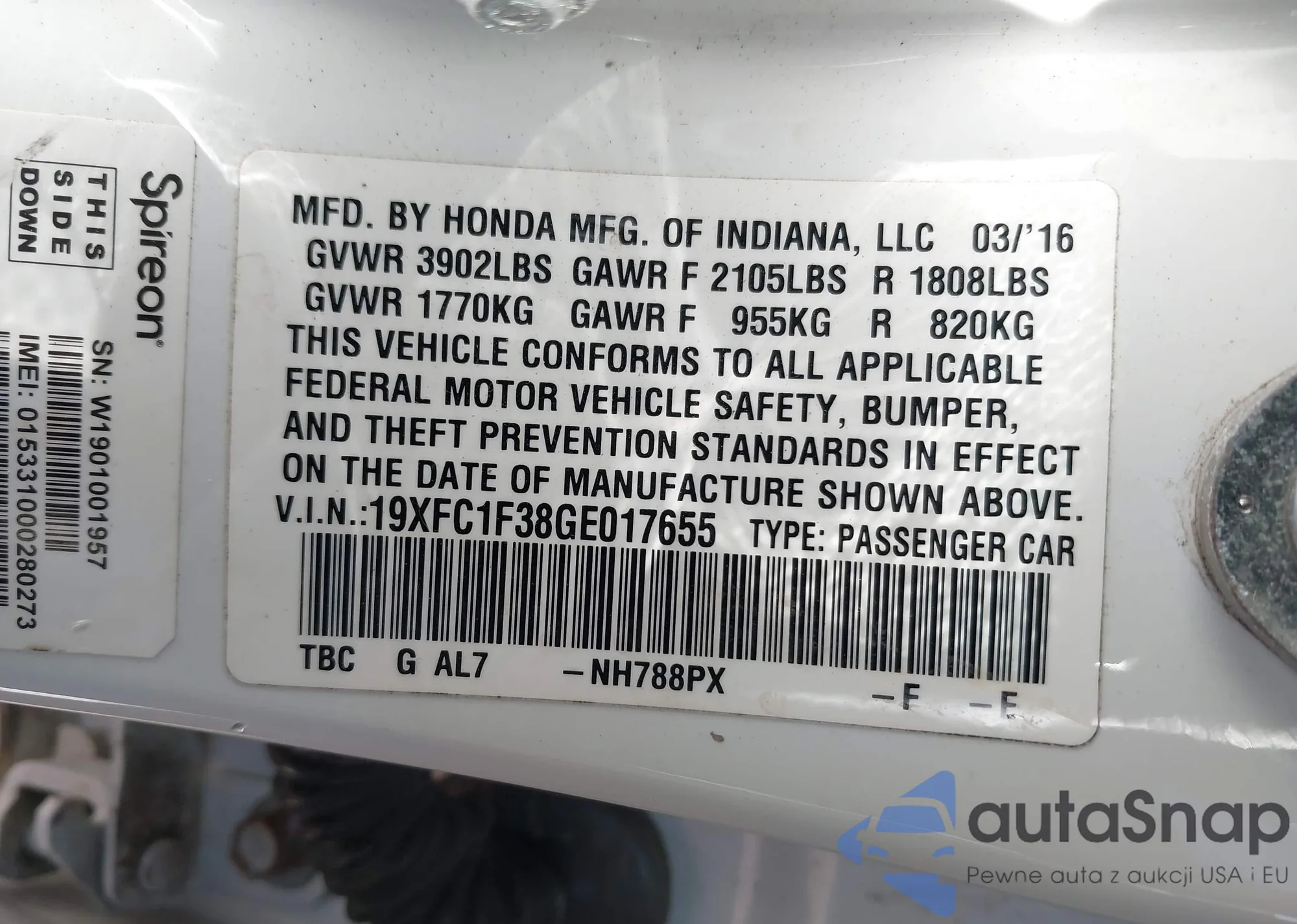 • VIN 19XFC1F38GE017655