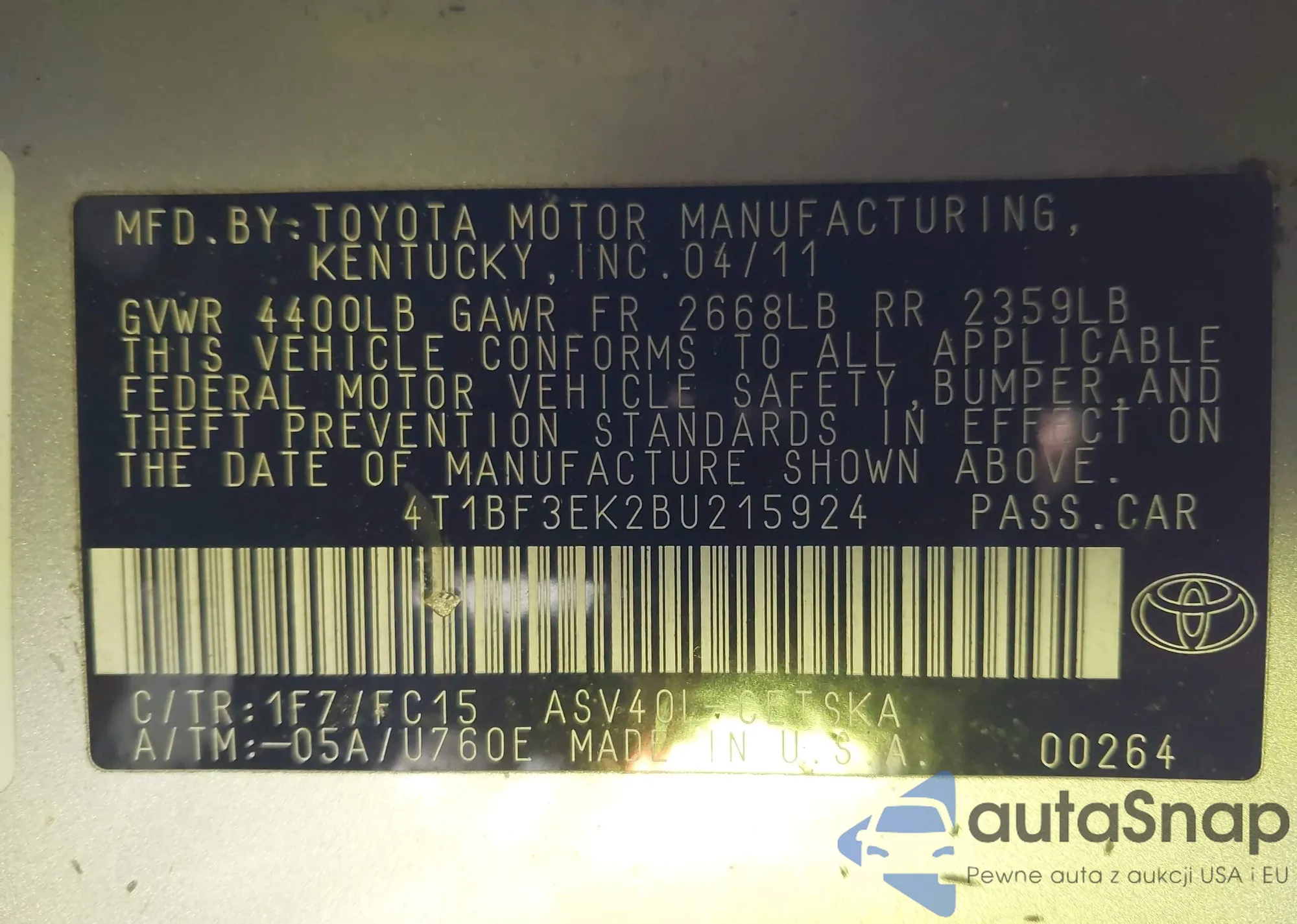 • VIN 4T1BF3EK2BU215924