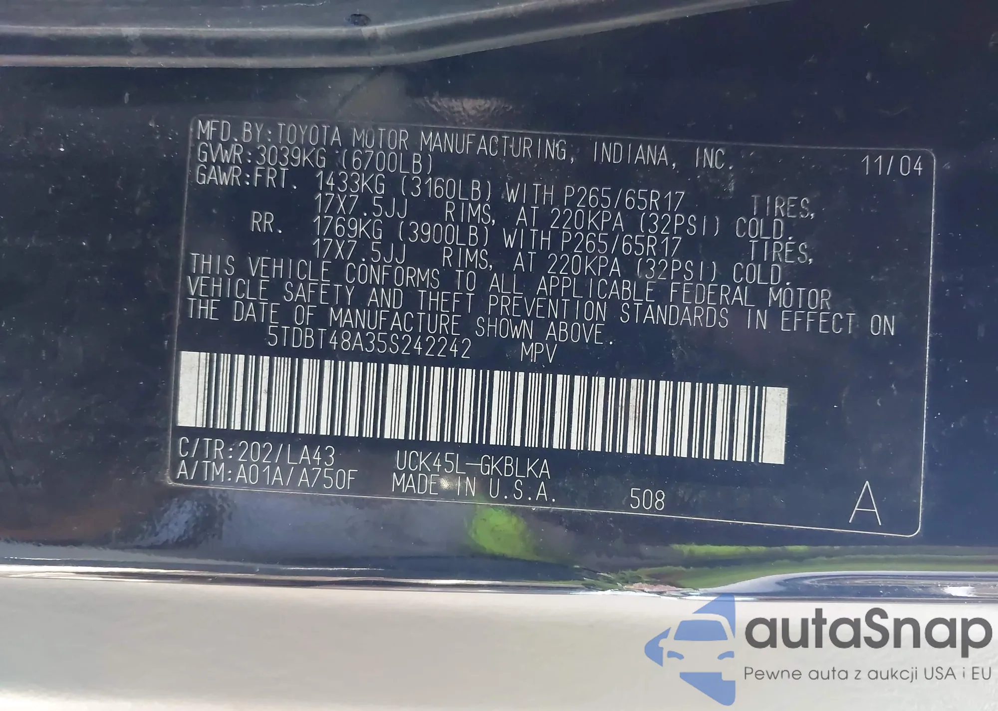 • VIN 5TDBT48A35S242242